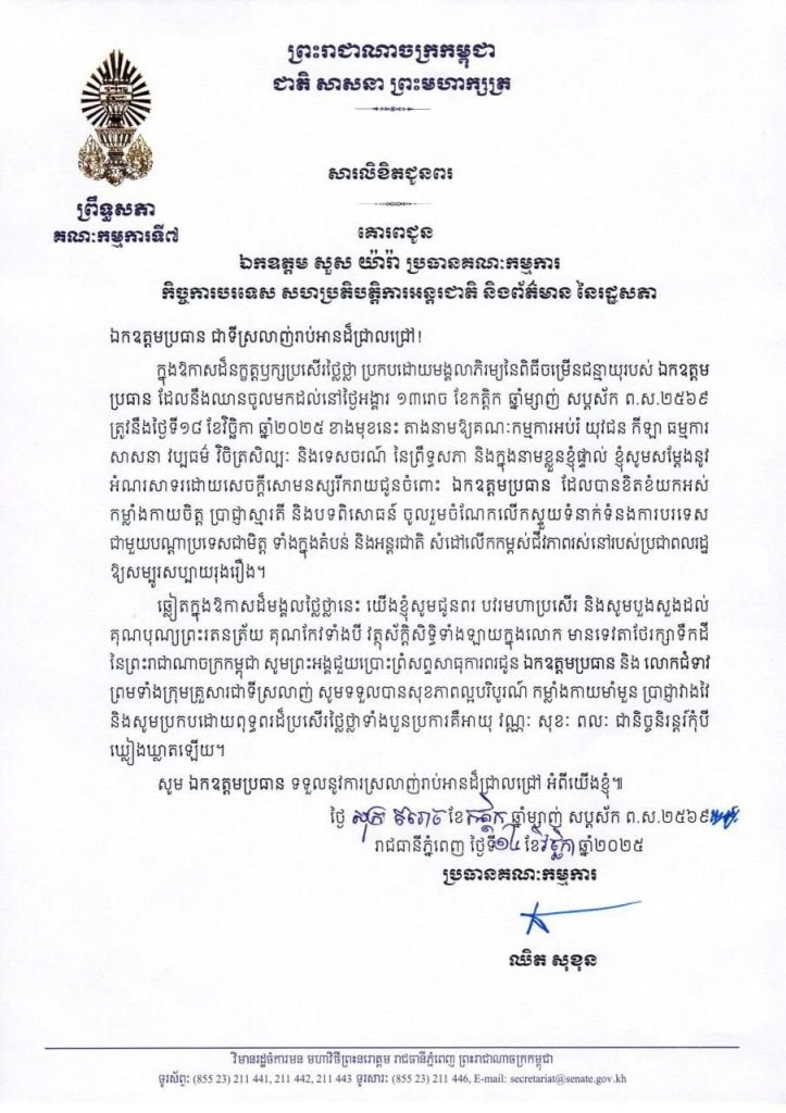 • សារលិខិតជូនពររបស់ឯកឧត្តម ឈិត សុខុន ប្រធានគណៈកម្មការ​ទី៧ព្រឹទ្ធសភា​ គោរពជូនឯកឧត្តម សួស យ៉ារ៉ា ប្រធានគណៈកម្មការ កិច្ចការបរទេស សហប្រតិបត្តិការអន្តរជាតិ និងព័ត៌មាន នៃរដ្ឋសភា​ ក្នុងឱកាស​នៃពិធីចម្រើនជន្មាយុរបស់ឯកឧត្តមប្រធាន ដែលនឹងឈានចូលមកដល់នៅថ្ងៃអង្គារ ទី១៨ ខែវិច្ឆិកា ឆ្នាំ២០២៥ ខាងមុខនេះ