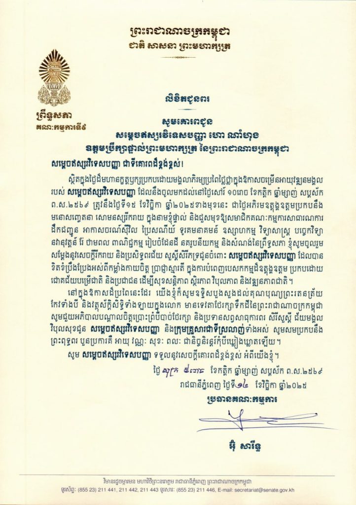 • លិខិតជូនពររបស់ឯកឧត្តម អ៊ុំ សារឹទ្ធ ប្រធានគណៈកម្មការ​ទី៩ព្រឹទ្ធសភា​ គោរពជូនសម្តេចឥស្សរវិទេសបញ្ញា ហោ ណាំហុង​ ឧត្តមប្រឹក្សាផ្ទាល់ព្រះមហាក្សត្រ នៃព្រះរាជាណាចក្រកម្ពុជា ក្នុងថ្ងៃដ៏មហានក្ខត្តឫក្សប្រកបដោយមង្គលាភិរម្យប្រពៃថ្លៃថ្លាក្នុងឱកាសចម្រើនអាយុវឌ្ឍនមង្គល របស់ សម្តេចឥស្សរវិទេសបញ្ញា ដែលនឹងចូលមកដល់នៅថ្ងៃសៅរ៍ ទី១៥ ខែវិច្ឆិកា ឆ្នាំ២០២៥ខាងមុខនេះ