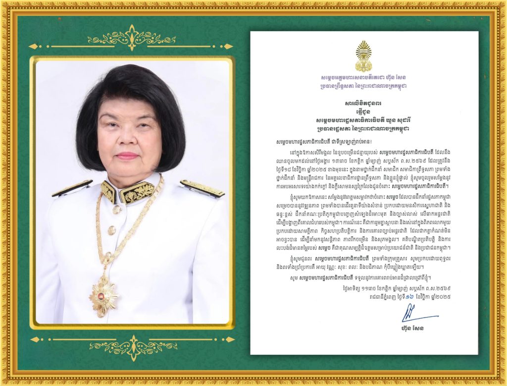 សារលិខិតជូនពររបស់សម្តេចអគ្គមហាសេនាបតីតេជោ ហ៊ុន សែន ប្រធានព្រឹទ្ធសភា នៃព្រះរាជាណាចក្រកម្ពុជា ជូនសម្តេចមហារដ្ឋសភាធិការធិបតី ឃួន សុដារី ប្រធានរដ្ឋសភា នៃព្រះរាជាណាចក្រកម្ពុជា ក្នុងឱកាសសិរីមង្គល នៃខួបចម្រើនជន្មាយុរបស់ សម្តេចមហារដ្ឋសភាធិការធិបតី ដែលនឹង ឈានចូលមកដល់នៅថ្ងៃអង្គារ ទី១៨ ខែវិច្ឆិកា ឆ្នាំ២០២៥ ខាងមុខនេះ