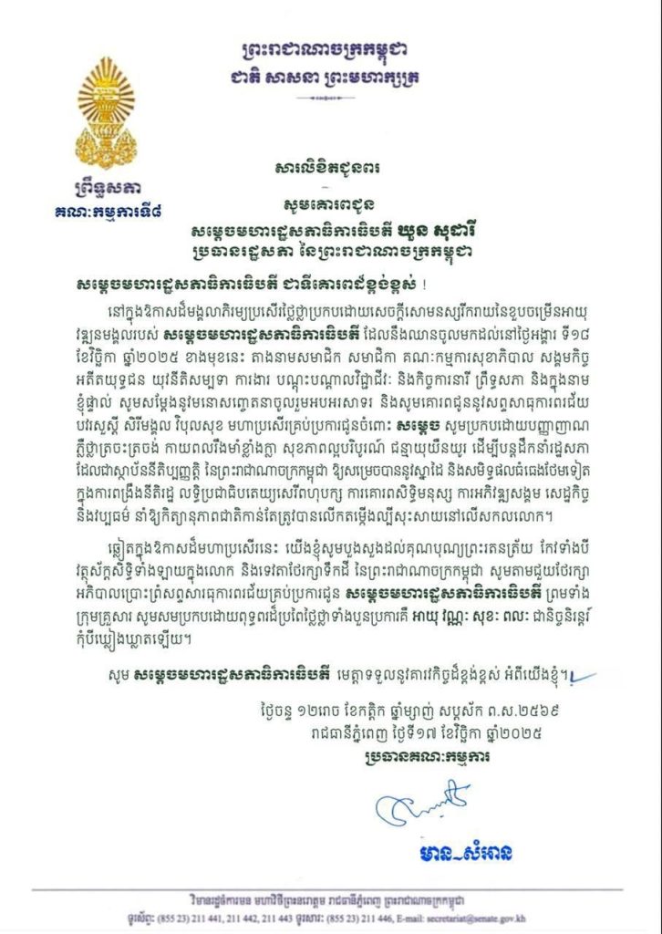 សារលិខិតជូនពររបស់លោកជំទាវ មាន សំអាន ប្រធានគណៈកម្មការទី៨ព្រឹទ្ធសភា គោរពជូនសម្តេចមហារដ្ឋសភាធិការធិបតី ឃួន សុដារី ប្រធានរដ្ឋសភា នៃព្រះរាជាណាចក្រកម្ពុជា ក្នុងឱកាសដ៏មង្គលាភិរម្យប្រសើរថ្លៃថ្លាប្រកបដោយសេចក្តីសោមនស្សរីករាយនៃខួបចម្រើនអាយុវឌ្ឍនមង្គលរបស់ សម្តេចមហារដ្ឋសភាធិការធិបតី ដែលនឹងឈានចូលមកដល់នៅថ្ងៃអង្គារ ទី១៨ ខែវិច្ឆិកា ឆ្នាំ២០២៥ ខាងមុខនេះ