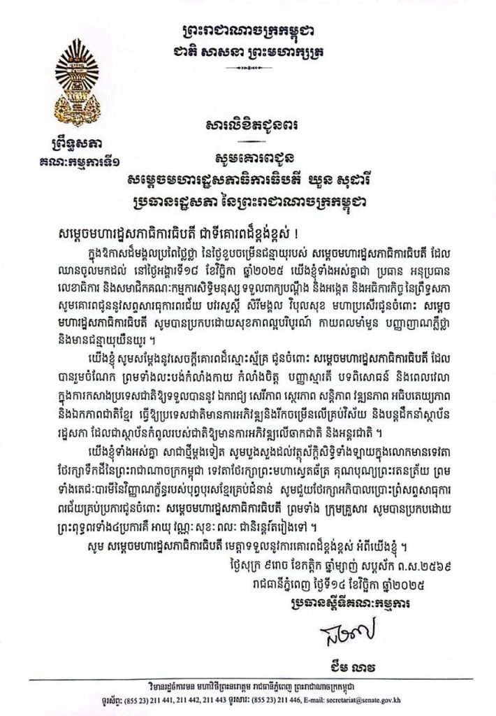 • សារលិខិតជូនពររបស់ឯកឧត្តម ជឹម លាវ ប្រធានស្តីទីគណៈកម្មការទី១ព្រឹទ្ធសភា គោរពជូនសម្តេចមហារដ្ឋសភាធិការធិបតី ឃួន សុដារី ប្រធានរដ្ឋសភា នៃព្រះរាជាណាចក្រកម្ពុជា ក្នុងឱកាសដ៏មង្គលប្រពៃថ្លៃថ្លា នៃថ្ងៃខួបចម្រើនជន្មាយុរបស់សម្តេចមហារដ្ឋសភាធិការធិបតី ដែលឈានចូលមកដល់នៅថ្ងៃអង្គារទី១៨ ខែវិច្ឆិកា ឆ្នាំ២០២៥នេះ