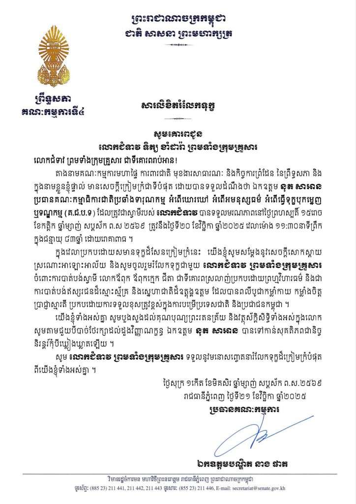 សារលិខិតរំលែកទុក្ខរបស់ឯកឧត្តមបណ្ឌិត នាង ផាត ប្រធានគណៈកម្មការទី៤ព្រឹទ្ធសភា គោរពជូន លោកជំទាវ ទិត្យ ខាំដារ៉ា ព្រមទាំងក្រុមគ្រួសារ ចំពោះមរណភាពរបស់ ឯកឧត្តម នុត សាអាន ប្រធានគណៈកម្មាធិការជាតិប្រឆាំងទារុណកម្ម អំពើឃោរឃៅ អំពើអមនុស្សធម៌ អំពើធ្វើទុក្ខបុកម្នេញ ឬទណ្ឌកម្ម (គ.ជ.ប.ទ) ដែលត្រូវជាស្វាមីរបស់លោកជំទាវ បានទទួលមរណភាពនៅថ្ងៃព្រហស្បតិ៍ ទី២០ ខែវិច្ឆិកា ឆ្នាំ២០២៥ វេលាម៉ោង ១១:៣០នាទីព្រឹក ក្នុងជន្មាយុ ៨៣ឆ្នាំ ដោយរោគាពាធ
