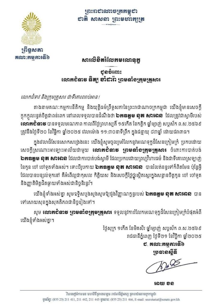 សារលិខិតរំលែកមរណទុក្ខរបស់ឯកឧត្តម អាយ ខន ប្រធានស្តីទីគណៈកម្មការទី៦ព្រឹទ្ធសភា ជូន លោកជំទាវ ទិត្យ ខាំដារ៉ា ព្រមទាំងក្រុមគ្រួសារ ចំពោះមរណភាពរបស់ ឯកឧត្តម នុត សាអាន ដែលត្រូវជាស្វាមីរបស់លោកជំទាវ បានទទួលមរណភាពកាលពីថ្ងៃព្រហស្បតិ៍ ទី២០ ខែវិច្ឆិកា ឆ្នាំ២០២៥ វេលាម៉ោង ១១:៣០នាទីព្រឹក ក្នុងជន្មាយុ ៨៣ឆ្នាំ ដោយជរាពាធ