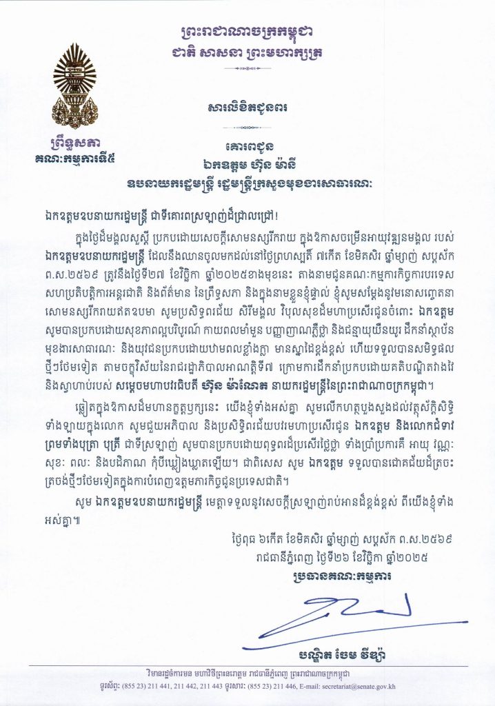 សារលិខិតជូនពររបស់ឯកឧត្តមបណ្ឌិត ចែម វីឌ្យ៉ា ប្រធានគណៈកម្មការទី៥ព្រឹទ្ធសភា គោរពជូន ឯកឧត្តម ហ៊ុន ម៉ានី ឧបនាយករដ្ឋមន្ត្រី រដ្ឋមន្ត្រីក្រសួងមុខងារសាធារណៈ ក្នុងថ្ងៃដ៏មង្គលសួស្តី ប្រកបដោយសេចក្តីសោមនស្សរីករាយ ក្នុងឱកាសចម្រើនអាយុវឌ្ឍនមង្គល របស់ ឯកឧត្តមឧបនាយករដ្ឋមន្ត្រី ដែលនឹងឈានចូលមកដល់នៅថ្ងៃព្រហស្បតិ៍ ទី២៧ ខែវិច្ឆិកា ឆ្នាំ២០២៥ខាងមុខនេះ