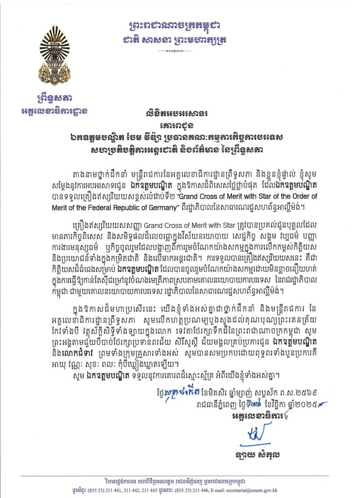 លិខិតអបអរសាទររបស់ឯកឧត្តម ឡាយ សំកុល អគ្គលេខាធិការព្រឹទ្ធសភា គោរពជូន ឯកឧត្តមបណ្ឌិត ចែម វីឌ្យ៉ា ប្រធានគណៈកម្មការកិច្ចការបរទេស សហប្រតិបត្តិការអន្តរជាតិ និងព័ត៌មាន នៃព្រឹទ្ធសភា ក្នុងឱកាសដ៏ពិសេសថ្លៃថ្លាបំផុតដែលឯកឧត្តមបណ្ឌិត បានទទួលគ្រឿងឥស្សរិយយសខ្ពស់លំដាប់ទី២ “Grand Cross of Merit with Star of the Order of Merit of the Federal Republic of Germany” ពីរដ្ឋាភិបាលនៃសាធារណរដ្ឋសហព័ន្ធអាល្លឺម៉ង់