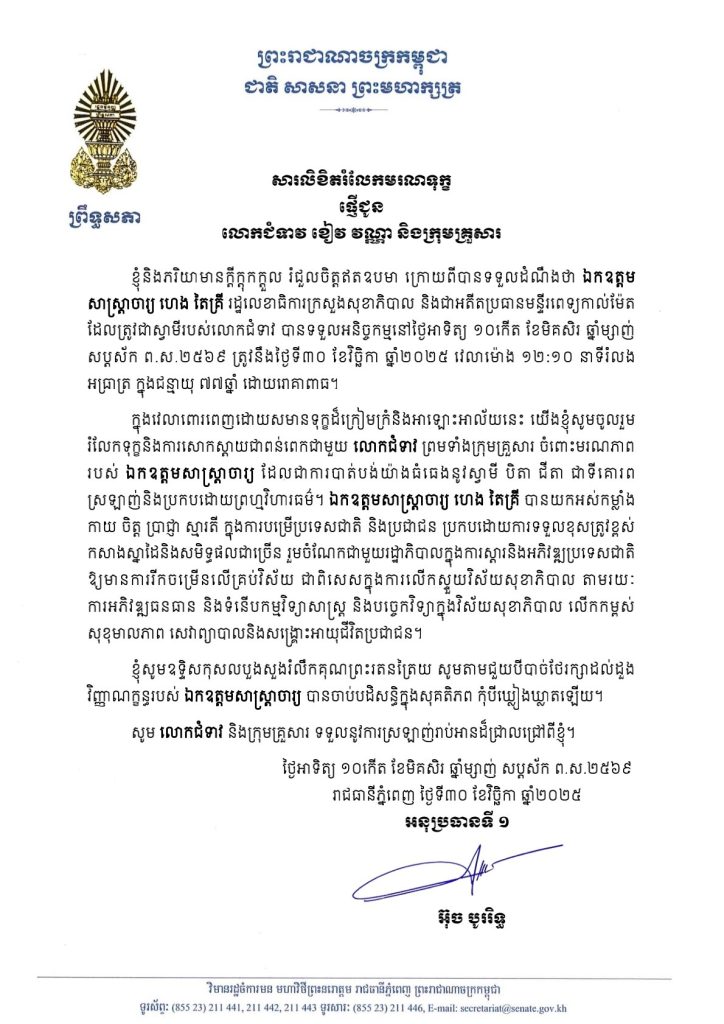សារលិខិតរំលែកមរណទុក្ខរបស់ឯកឧត្តម អ៊ុច បូររិទ្ធ អនុប្រធានទី១ព្រឹទ្ធសភា ជូន លោកជំទាវ ខៀវ វណ្ណា និងក្រុមគ្រួសារ ចំពោះមរណភាពរបស់ ឯកឧត្តម សាស្ត្រាចារ្យ ហេង តៃគ្រី រដ្ឋលេខាធិការក្រសួងសុខាភិបាល និងជាអតីតប្រធានមន្ទីរពេទ្យកាល់ម៉ែត ដែលត្រូវជាស្វាមីរបស់លោកជំទាវ បានទទួលអនិច្ចកម្មនៅថ្ងៃអាទិត្យ ទី៣០ ខែវិច្ឆិកា ឆ្នាំ២០២៥ វេលាម៉ោង១២:១០ នាទីរំលងអធ្រាត្រ ក្នុងជន្មាយុ ៧៧ឆ្នាំ ដោយរោគាពាធ