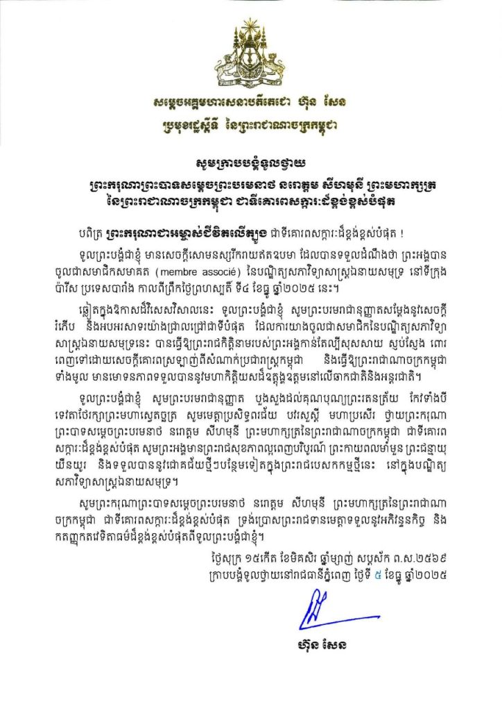 សម្តេចអគ្គមហាសេនាបតីតេជោ ហ៊ុន សែន ប្រមុខរដ្ឋស្តីទី នៃព្រះរាជាណាចក្រកម្ពុជា ថ្វាយសារលិខិតអបអរសាទរ ព្រះករុណាព្រះបាទសម្តេចព្រះបរមនាថ នរោត្តម សីហមុនី ព្រះមហាក្សត្រ នៃព្រះរាជាណាចក្រកម្ពុជា ក្នុងឱកាសដ៏វិសេសវិសាល ព្រះករុណាជាអម្ចាស់ជីវិតលើត្បូង ក្លាយជាសមាជិកសមាគត (membre associé) នៃបណ្ឌិតសភាវិទ្យាសាស្ត្រឯនាយសមុទ្រ នៅទីក្រុងប៉ារីស ប្រទេសបារាំង កាលពីព្រឹកថ្ងៃព្រហស្បតិ៍ ទី៤ ខែធ្នូ ឆ្នាំ២០២៥