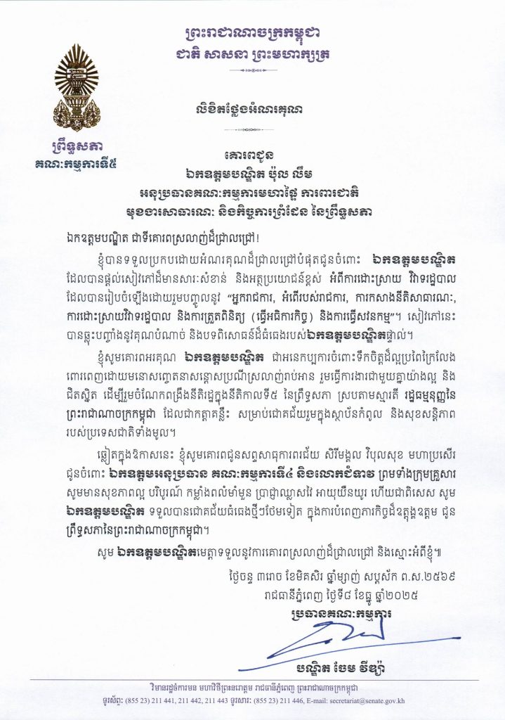 លិខិតថ្លែងអំណរគុណរបស់ឯកឧត្តមបណ្ឌិត ចែម វីឌ្យ៉ា ប្រធានគណៈកម្មការទី៥ព្រឹទ្ធសភា គោរពជូន ឯកឧត្តមបណ្ឌិត ប៉ុល លឹម អនុប្រធានគណៈកម្មការមហាផ្ទៃ ការពារជាតិ មុខងារសាធារណៈ និងកិច្ចការព្រំដែន នៃព្រឹទ្ធសភា ដែលឯកឧត្តមបណ្ឌិត បានផ្តល់ជូនឯកឧត្តមបណ្ឌិត ប្រធានគណៈកម្មការទី៥ព្រឹទ្ធសភា នូវសៀវភៅដ៏មានសារៈសំខាន់ និងអត្ថប្រយោជន៍ខ្ពស់ អំពីការដោះស្រាយ វិវាទរដ្ឋបាល ដែលបានរៀបចំឡើងដោយរួមបញ្ចូលនូវ «អ្នករាជការ, អំពើរបស់រាជការ, ការកសាងនីតិសាធារណៈ, ការដោះស្រាយវិវាទរដ្ឋបាល និងការត្រួតពិនិត្យ (ធ្វើអធិការកិច្ច) និងការធ្វើសវនកម្ម»