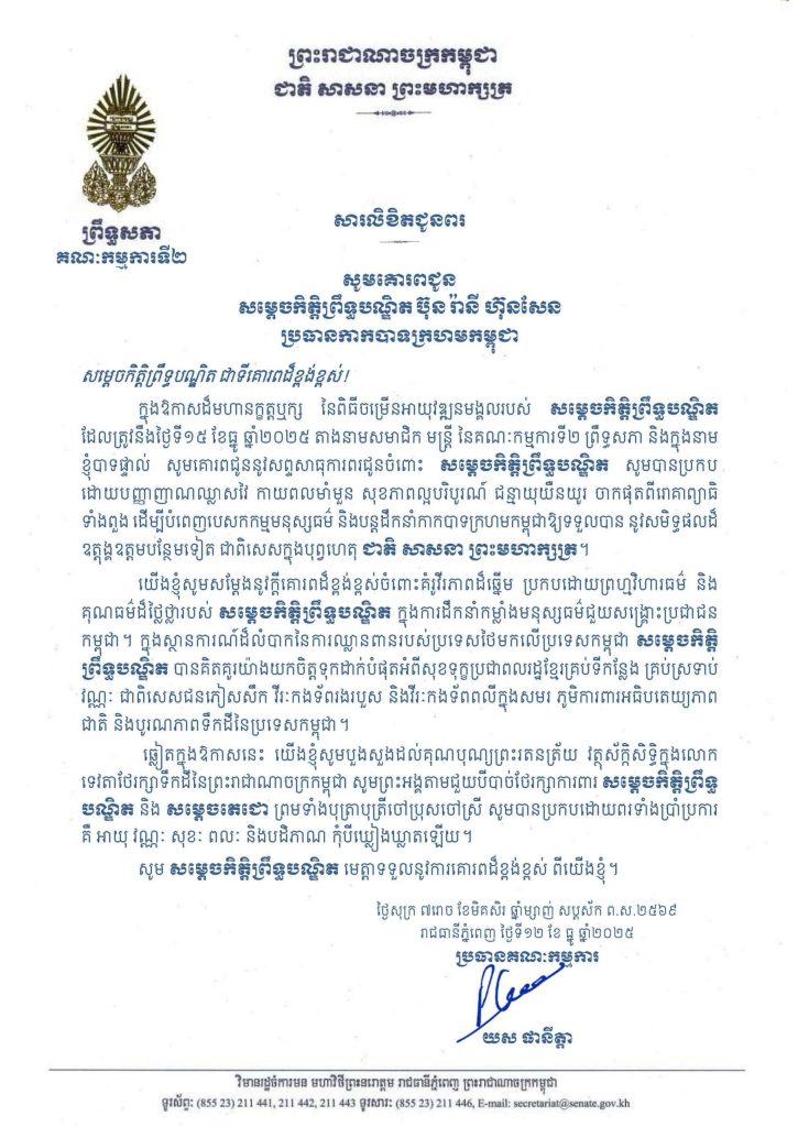 សារលិខិតជូនពររបស់ឯកឧត្តម យស ផានីត្តា ប្រធានគណៈកម្មការទី២ព្រឹទ្ធសភា គោរពជូន សម្តេចកិត្តិព្រឹទ្ធបណ្ឌិត ប៊ុន រ៉ានី ហ៊ុនសែន ប្រធានកាកបាទក្រហមកម្ពុជា ក្នុងឱកាសដ៏មហានក្ខត្តឬក្ស នៃពិធីចម្រើនអាយុវឌ្ឍនមង្គលរបស់ សម្តេចកិត្តិព្រឹទ្ធបណ្ឌិត ដែលត្រូវនឹងថ្ងៃទី១៥ ខែធ្នូ ឆ្នាំ២០២៥