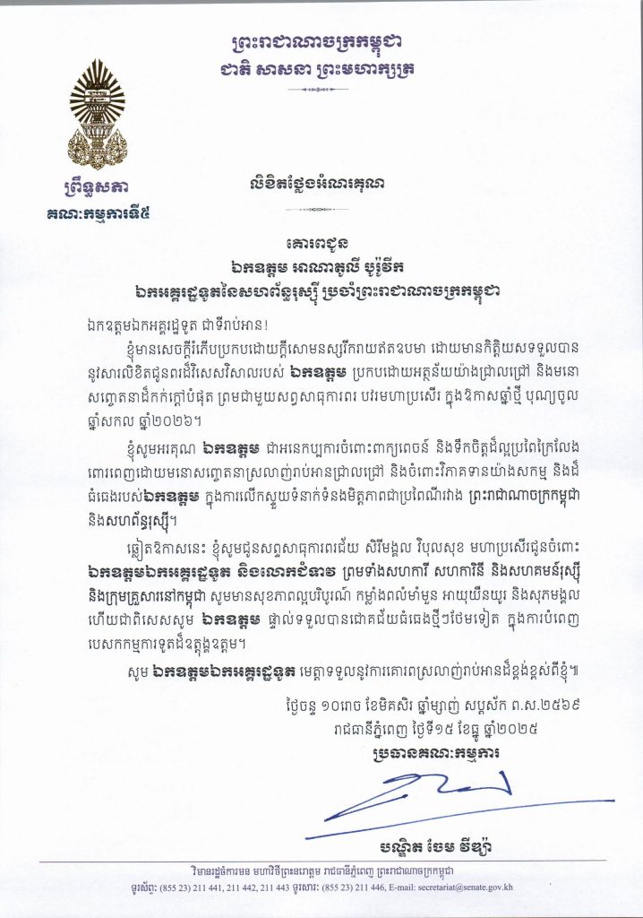 លិខិតថ្លែងអំណរគុណរបស់ឯកឧត្តមបណ្ឌិត ចែម វីឌ្យ៉ា ប្រធានគណៈកម្មការទី៥ព្រឹទ្ធសភា គោរពជូន ឯកឧត្តម អាណាតូលី បូរ៉ូវីក ឯកអគ្គរដ្ឋទូតនៃសហព័ន្ធរុស្ស៊ី ប្រចាំព្រះរាជាណាចក្រកម្ពុជា ក្នុងឱកាសឆ្នាំថ្មី បុណ្យចូលឆ្នាំសកល ឆ្នាំ២០២៦
