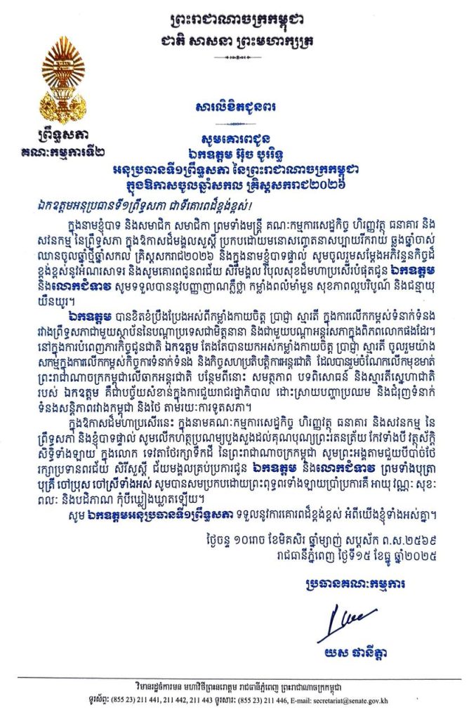 សារលិខិតជូនពររបស់ឯកឧត្តម យស ផានីត្តា ប្រធានគណៈកម្មការទី២ព្រឹទ្ធសភា គោរពជូន ឯកឧត្តម អ៊ុច បូររិទ្ធ អនុប្រធានទី១ព្រឹទ្ធសភា នៃព្រះរាជាណាចក្រកម្ពុជា ក្នុងឱកាសដ៏មង្គលសួស្តី ប្រកបដោយមនោសញ្ចេតនាសប្បាយរីករាយ ឆ្លងឆ្នាំចាស់ ឈានចូលឆ្នាំថ្មីឆ្នាំសកល គ្រិស្តសករាជ២០២៦