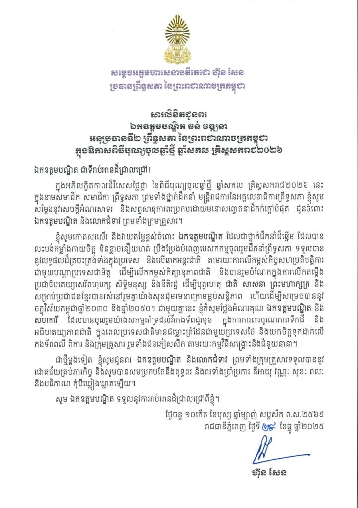 សារលិខិតថ្វាយព្រះពរ និងជូនពររបស់សម្តេចអគ្គមហាសេនាបតីតេជោ ហ៊ុន សែន ប្រធានព្រឹទ្ធសភា នៃព្រះរាជាណាចក្រកម្ពុជា ថ្វាយព្រះពរ និងជូនពរ ថ្នាក់ដឹកនាំ សមាជិក សមាជិការដ្ឋសភា នៃព្រះរាជាណាចក្រកម្ពុជា និងថ្នាក់ដឹកនាំ មន្ត្រីរាជការនៃអគ្គលេខាធិការដ្ឋានរដ្ឋសភា ក្នុងឱកាសពិធីបុណ្យចូលឆ្នាំថ្មី ឆ្នាំសកល គ្រិស្តសករាជ២០២៦