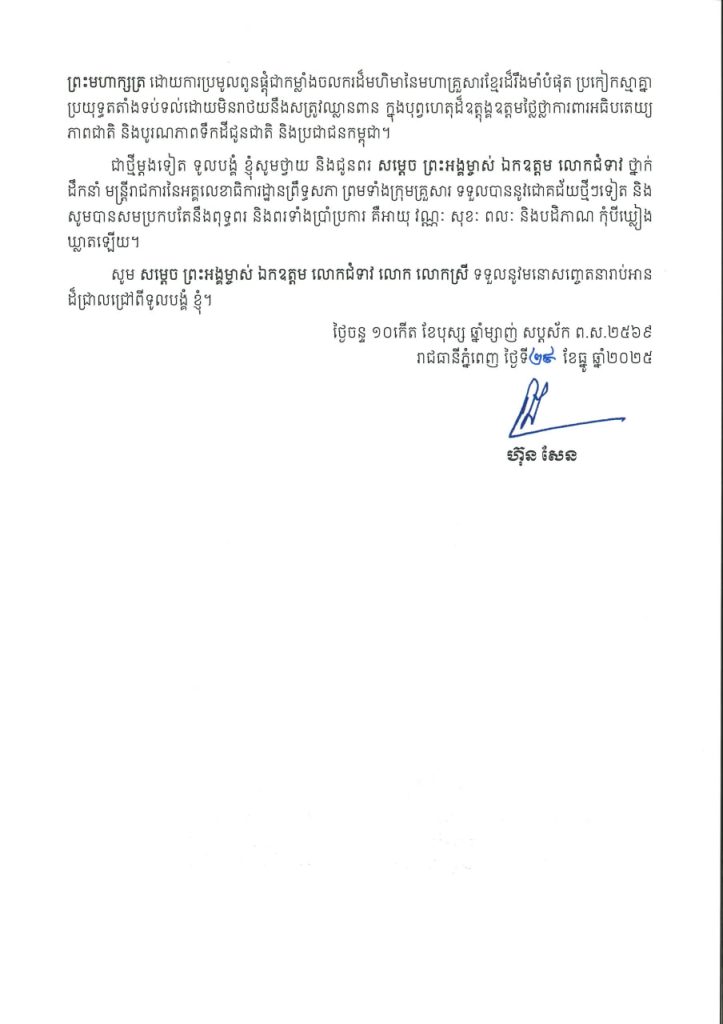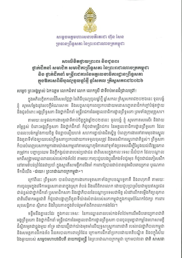 សារលិខិតថ្វាយព្រះពរ និងជូនពររបស់សម្តេចអគ្គមហាសេនាបតីតេជោ ហ៊ុន សែន ប្រធានព្រឹទ្ធសភា នៃព្រះរាជាណាចក្រកម្ពុជា ថ្វាយព្រះពរ និងជូនពរ ថ្នាក់ដឹកនាំ សមាជិក សមាជិកាព្រឹទ្ធសភា នៃព្រះរាជាណាចក្រកម្ពុជា និងថ្នាក់ដឹកនាំ មន្ត្រីរាជការនៃអគ្គលេខាធិការដ្ឋានព្រឹទ្ធសភា ក្នុងឱកាសពិធីបុណ្យចូលឆ្នាំថ្មី ឆ្នាំសកល គ្រិស្តសករាជ២០២៦