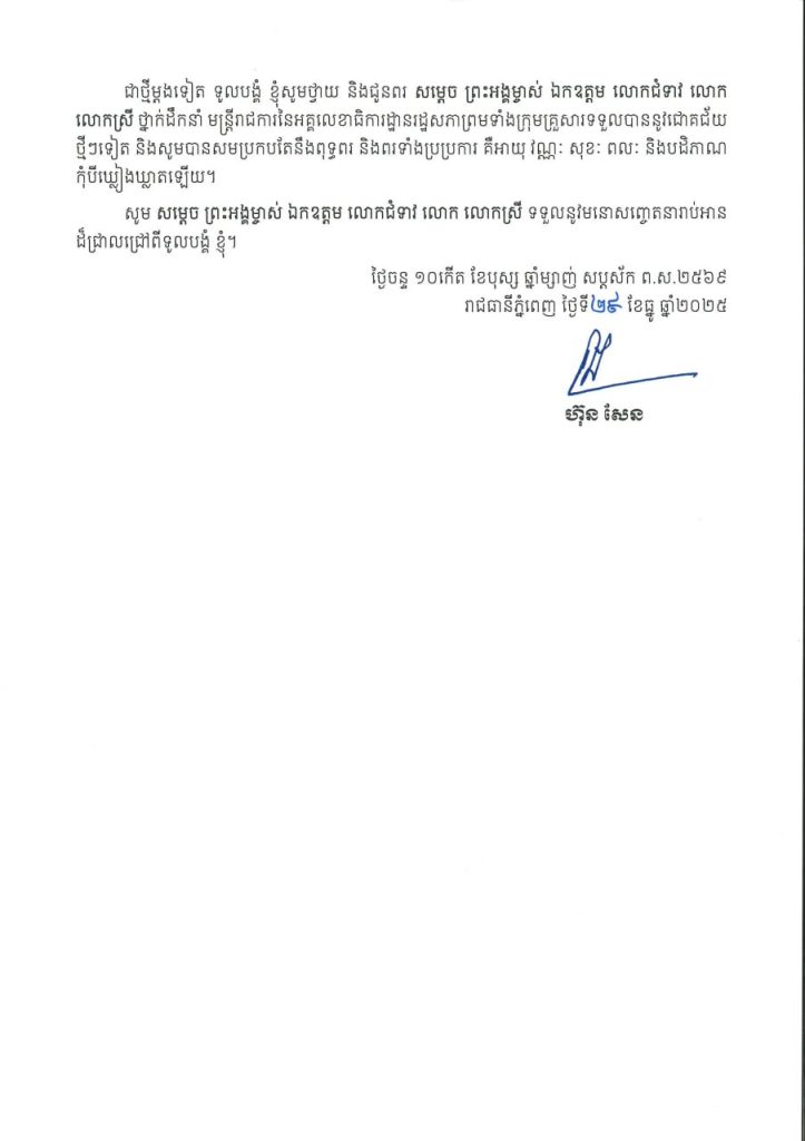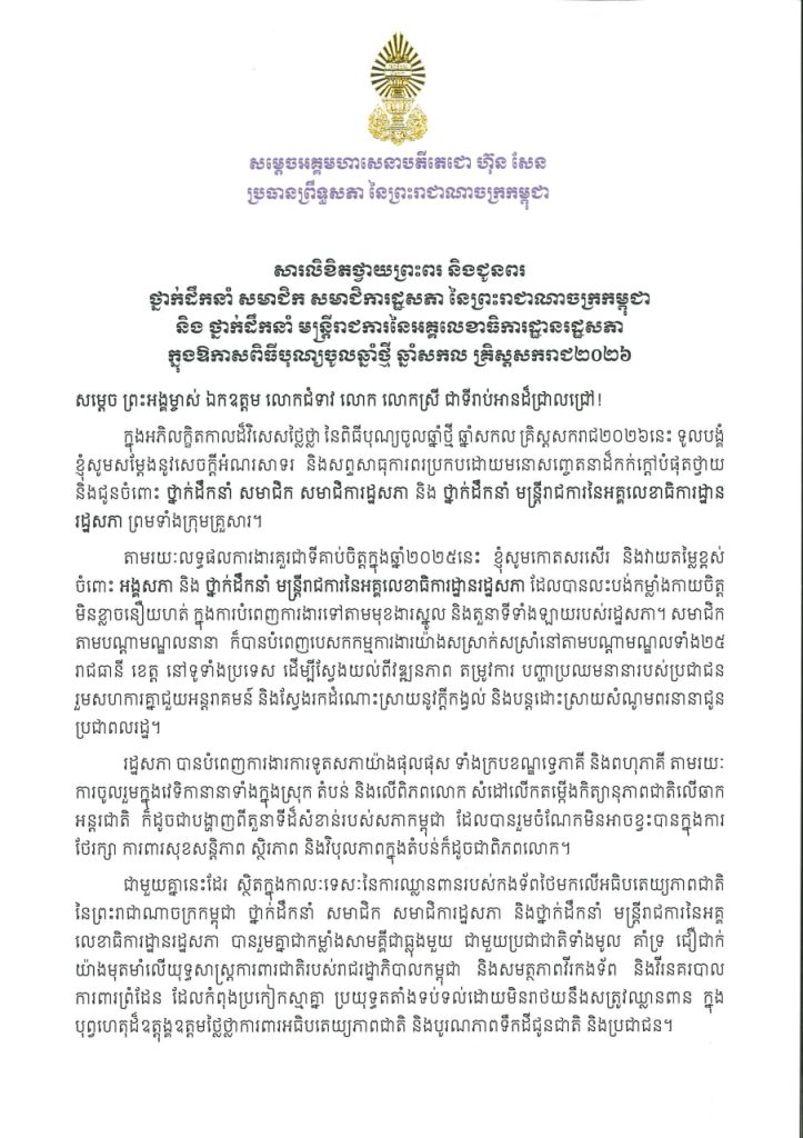 សារលិខិតថ្វាយព្រះពរ និងជូនពររបស់សម្តេចអគ្គមហាសេនាបតីតេជោ ហ៊ុន សែន ប្រធានព្រឹទ្ធសភា នៃព្រះរាជាណាចក្រកម្ពុជា ថ្វាយព្រះពរ និងជូនពរ ថ្នាក់ដឹកនាំ សមាជិក សមាជិការដ្ឋសភា នៃព្រះរាជាណាចក្រកម្ពុជា និងថ្នាក់ដឹកនាំ មន្ត្រីរាជការនៃអគ្គលេខាធិការដ្ឋានរដ្ឋសភា ក្នុងឱកាសពិធីបុណ្យចូលឆ្នាំថ្មី ឆ្នាំសកល គ្រិស្តសករាជ២០២៦