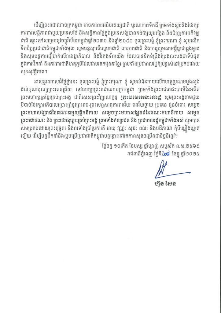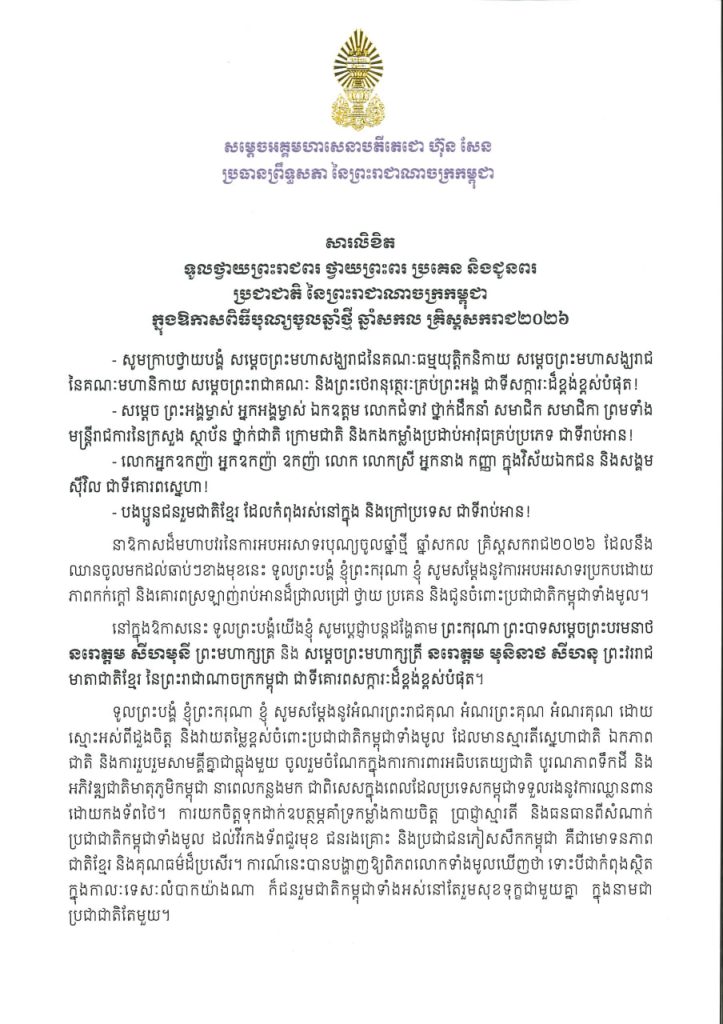 សារលិខិតថ្វាយព្រះពរ និងជូនពររបស់សម្តេចអគ្គមហាសេនាបតីតេជោ ហ៊ុន សែន ប្រធានព្រឹទ្ធសភា នៃព្រះរាជាណាចក្រកម្ពុជា ថ្វាយព្រះពរ និងជូនពរ ថ្នាក់ដឹកនាំ សមាជិក សមាជិការដ្ឋសភា នៃព្រះរាជាណាចក្រកម្ពុជា និងថ្នាក់ដឹកនាំ មន្ត្រីរាជការនៃអគ្គលេខាធិការដ្ឋានរដ្ឋសភា ក្នុងឱកាសពិធីបុណ្យចូលឆ្នាំថ្មី ឆ្នាំសកល គ្រិស្តសករាជ២០២៦