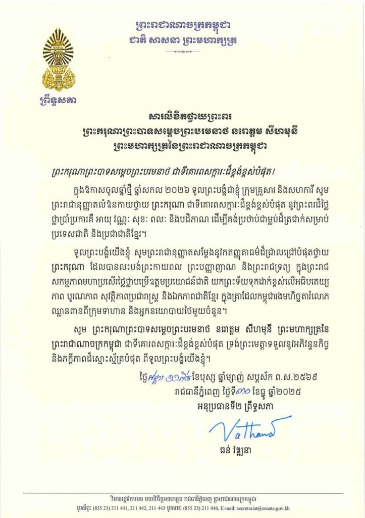 សារលិខិតថ្វាយព្រះពររបស់ឯកឧត្តមបណ្ឌិត ធន់ វឌ្ឍនា អនុប្រធានទី២ព្រឹទ្ធសភា នៃព្រះរាជាណាចក្រកម្ពុជា ថ្វាយព្រះពរ ព្រះករុណាព្រះបាទសម្តេចព្រះបរមនាថ នរោត្តម សីហមុនី ព្រះមហាក្សត្រនៃព្រះរាជាណាចក្រកម្ពុជា ក្នុងឱកាសចូលឆ្នាំថ្មី ឆ្នាំសកល ២០២៦