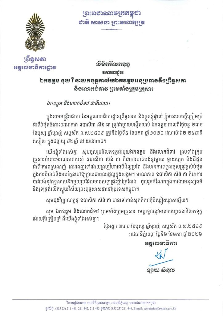 លិខិតរំលែកទុក្ខរបស់ឯកឧត្តម ឡាយ សំកុល អគ្គលេខាធិការព្រឹទ្ធសភា គោរពជូន ឯកឧត្តម ទុយ រី នាយកខុទ្ទកាល័យឯកឧត្តមអនុប្រធានទី១ព្រឹទ្ធសភា និងលោកជំទាវ ព្រមទាំងក្រុមគ្រួសារ ចំពោះមរណភាព ឧបាសិកា ស៊ន់ គា ត្រូវជាម្តាយបង្កើតរបស់ឯកឧត្តម កាលពីថ្ងៃចន្ទ ទី៥ ខែមករា ឆ្នាំ២០២៦ វេលាម៉ោង២:២៥នាទីរសៀល ក្នុងជន្មាយុ ៩២ឆ្នាំ ដោយជរាពាធ
