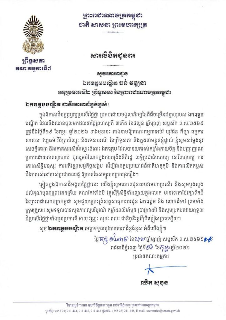 សារលិខិតជូនពររបស់ឯកឧត្តម ឈិត សុខុន ប្រធានគណៈកម្មការទី៧ព្រឹទ្ធសភា គោរពជូន ឯកឧត្តមបណ្ឌិត ធន់ វឌ្ឍនា អនុប្រធានទី២ព្រឹទ្ធសភា នៃព្រះរាជាណាចក្រកម្ពុជា ក្នុងឱកាសដ៏នក្ខត្តឫក្សប្រសើរថ្លៃថ្លា ប្រកបដោយមង្គលាភិរម្យនៃពិធីចម្រើនជន្មាយុរបស់ ឯកឧត្តមបណ្ឌិត ដែលនឹងឈានចូលមកដល់នាថ្ងៃព្រហស្បតិ៍ ទី១៩ ខែកុម្ភៈ ឆ្នាំ២០២៦ ខាងមុខនេះ