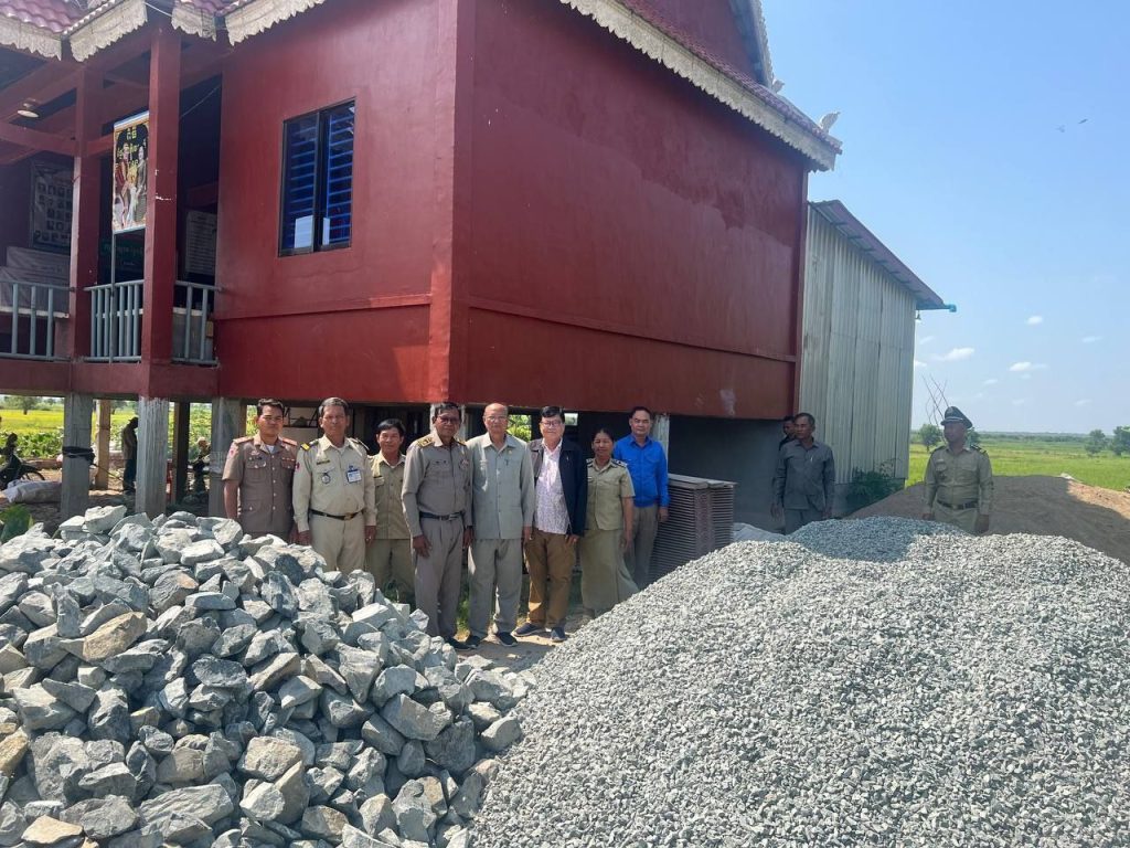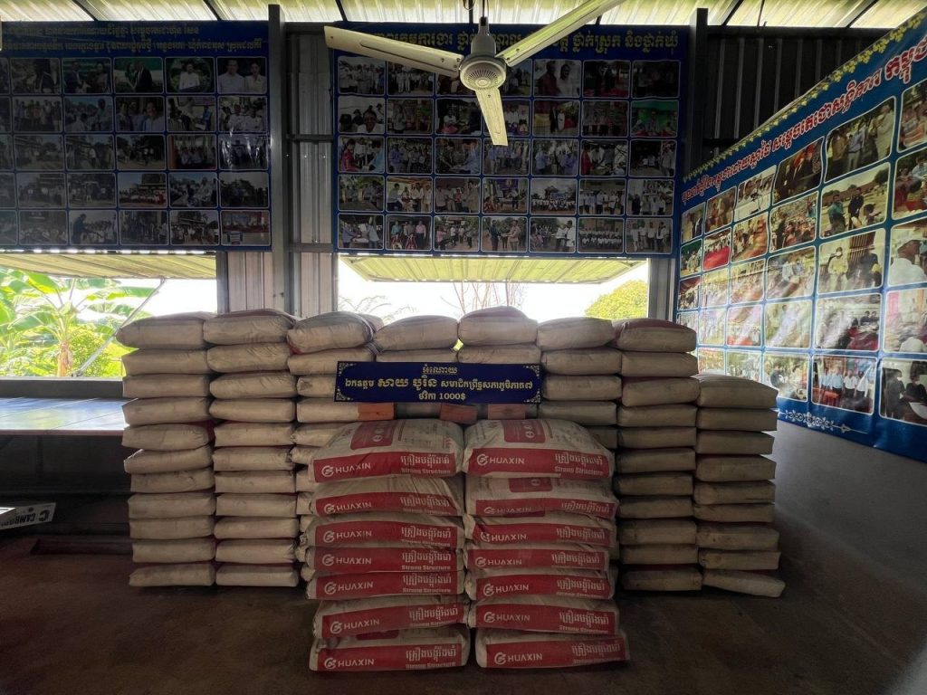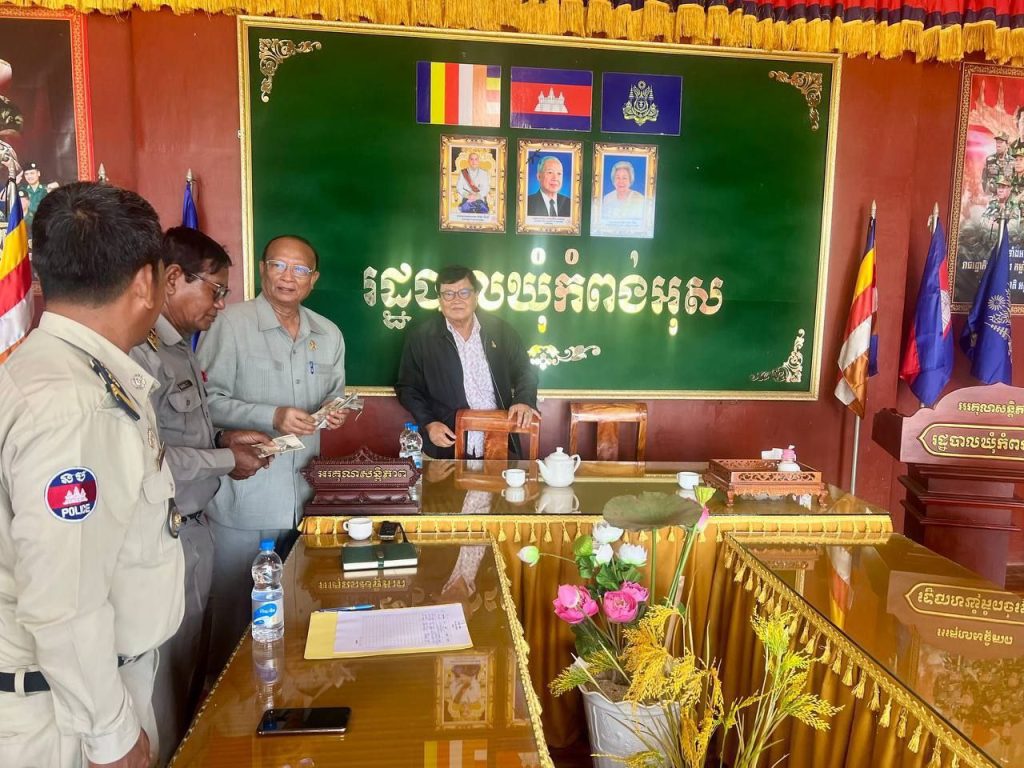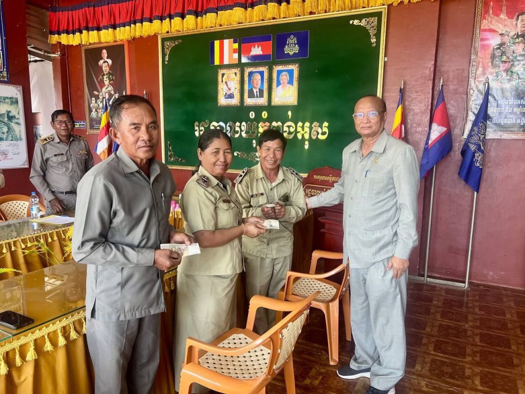 ក្នុងឱកាសនោះដែរ ឯកឧត្តម អ៊ឹង លាងហ៊ួ បានជូនក្រមាមួយចំនួន និងឯកឧត្តម សាយ បូរិន បានឧបត្ថម្ភថវិកាមួយចំនួនជូនក្រុមប្រឹក្សាឃុំ ស្មៀនឃុំ ប៉ុស្តិ៍រដ្ឋបាលឃុំ ភូមិ និងព្រមទាំងបានថតរូបភាពអនុស្សាវរីយ៍ ប្រគល់ ទទួល ស៊ីម៉ង់៥តោន ខ្សាច់២០ម៉ែត្រគីប និងថ្ម២០ម៉ែត្រគីប សរុបថវិកា ១,០០០ដុល្លារ ជាការឧបត្ថមរបស់ឯកឧត្តម សាយ បូរិន សម្រាប់ចាក់សាបក្រោមសាលាឃុំផងដែរ។