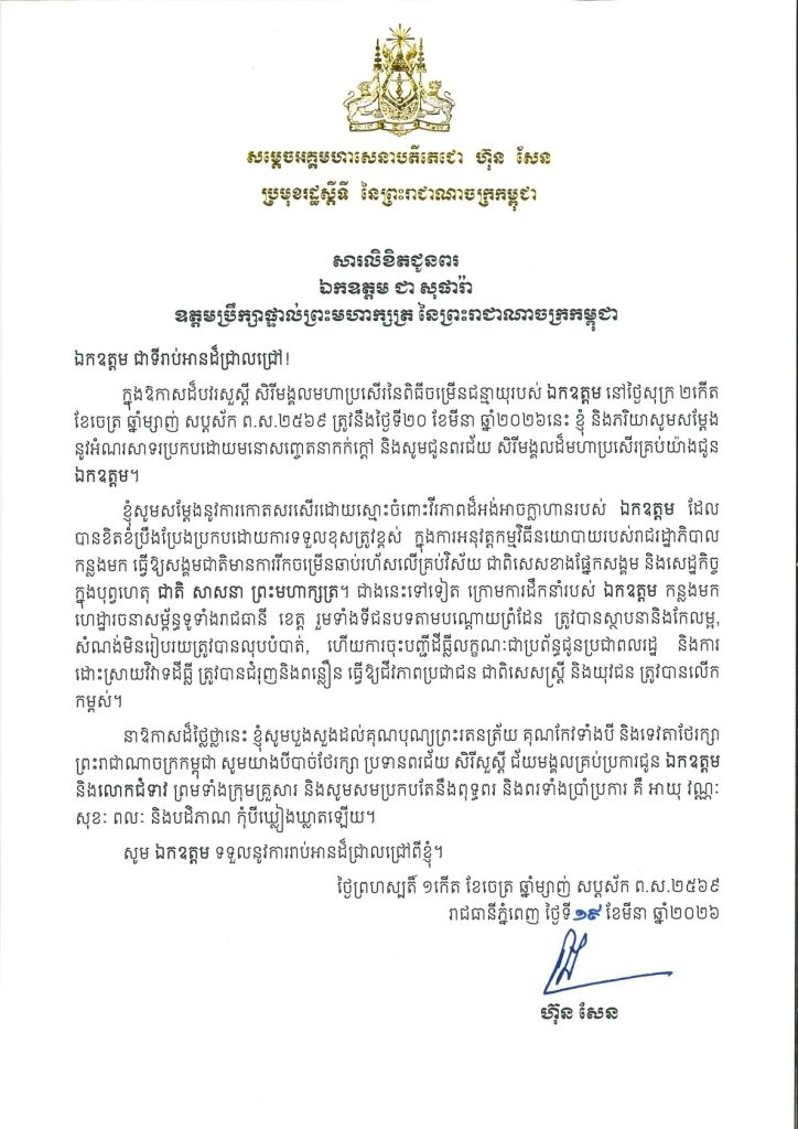 • សារលិខិតជូនពររបស់សម្តេចអគ្គមហាសេនាបតីតេជោ ហ៊ុន សែន ប្រមុខរដ្ឋស្តីទី នៃព្រះរាជាណាចក្រកម្ពុជា​ ជូន ឯកឧត្តម ជា សុផារ៉ា ឧត្តមប្រឹក្សាផ្ទាល់ព្រះមហាក្សត្រ នៃព្រះរាជាណាចក្រកម្ពុជា ក្នុងឱកាសដ៏បវរសួស្តី សិរីមង្គលមហាប្រសើរនៃពិធីចម្រើនជន្មាយុរបស់ ឯកឧត្តម នៅថ្ងៃសុក្រ ទី២០ ខែមីនា ឆ្នាំ២០២៦នេះ
