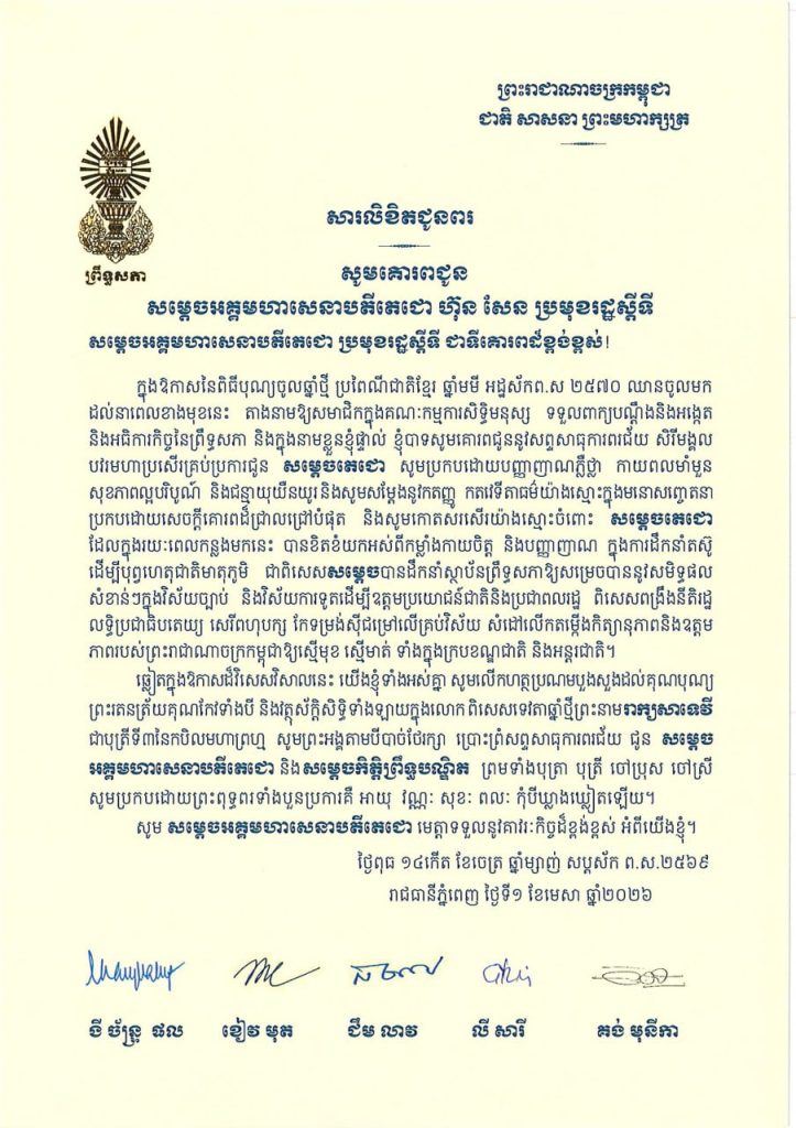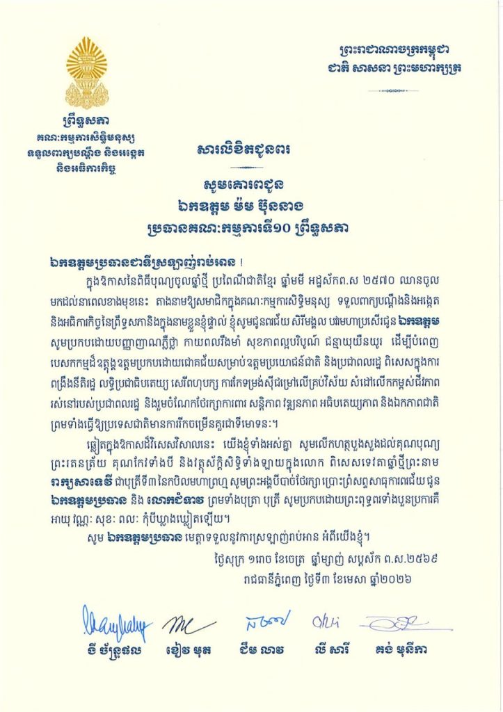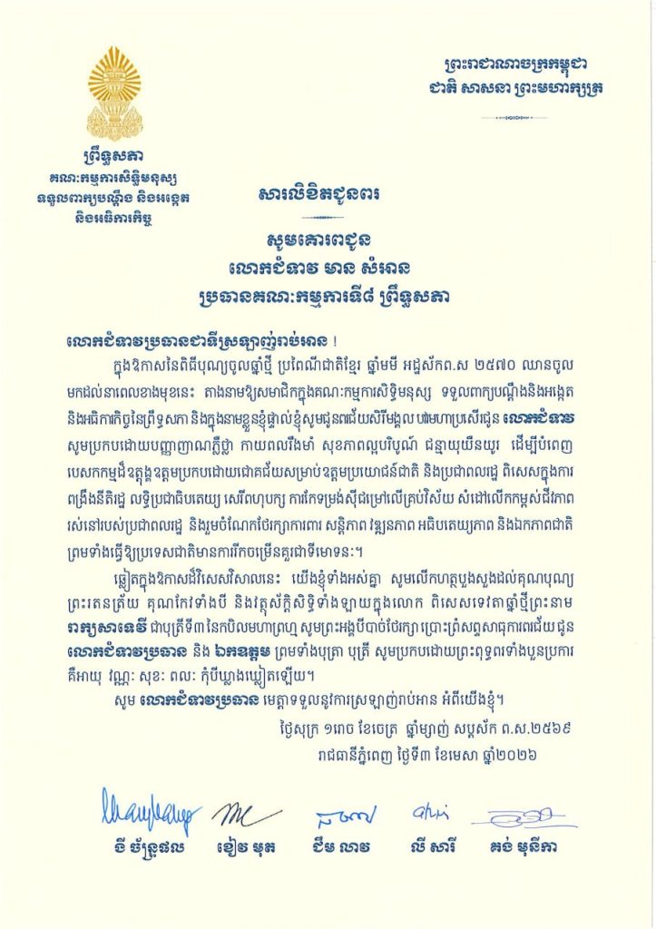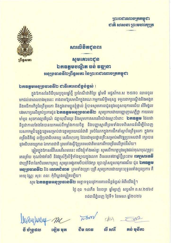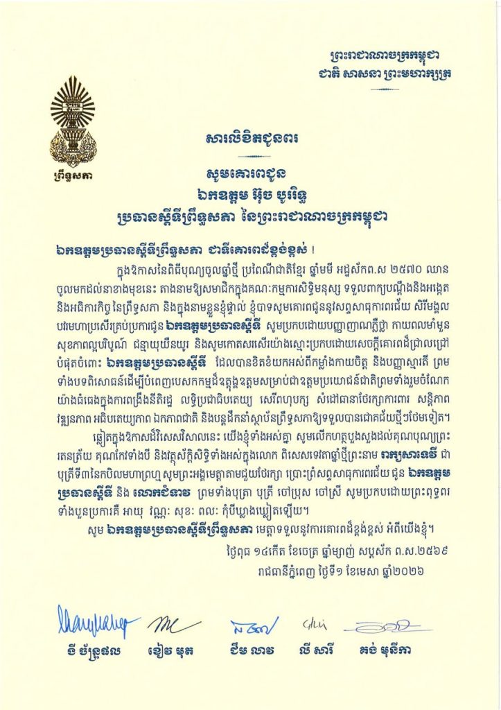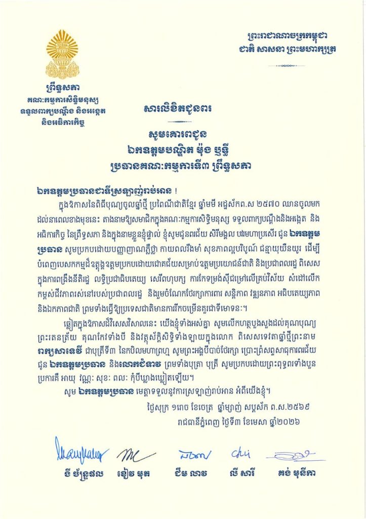 សារលិខិតជូនពររបស់ សមាជិក សមាជិកាគណៈកម្មការទី១ព្រឹទ្ធសភា ក្នុងឱកាសនៃពិធីបុណ្យចូលឆ្នាំថ្មី ប្រពៃណីជាតិខ្មែរ ឆ្នាំមមី អដ្ឋស័កព.ស.២៥៧០ ឈានចូលមកដល់នាពេលខាងមុខនេះ គោរពជូន៖១-សម្តេចអគ្គមហាសេនាបតីតេជោ ហ៊ុន សែន ប្រមុខរដ្ឋស្តីទី នៃព្រះរាជាណាចក្រកម្ពុជា២-សម្តេចកិត្តិព្រឹទ្ធបណ្ឌិត ប៊ុន រ៉ានី ហ៊ុនសែន ប្រធានកាកបាទក្រហមកម្ពុជា៣-ឯកឧត្តម អ៊ុច បូររិទ្ធ ប្រធានស្តីទីព្រឹទ្ធសភា នៃព្រះរាជាណាចក្រកម្ពុជា៤-ឯកឧត្តមបណ្ឌិត ធន់ វឌ្ឍនា អនុប្រធានទី២ព្រឹទ្ធសភា នៃព្រះរាជាណាចក្រកម្ពុជា៥-ឯកឧត្តម យស ផានីត្តា ប្រធានគណៈកម្មការទី២ ព្រឹទ្ធសភា៦-ឯកឧត្តមបណ្ឌិត ម៉ុង ឫទ្ធី ប្រធានគណៈកម្មការទី៣ ព្រឹទ្ធសភា៧-ឯកឧត្តមបណ្ឌិត នាង ផាត ប្រធានគណៈកម្មការទី៤ ព្រឹទ្ធសភា៨-ឯកឧត្តមបណ្ឌិត ឈីវ យីស៊ាង ប្រធានគណៈកម្មការទី៥ ព្រឹទ្ធសភា៩-លោកជំទាវបណ្ឌិត ចាន់ សុទ្ធាវី ប្រធានគណៈកម្មការទី៦ ព្រឹទ្ធសភា១០-ឯកឧត្តម ឈិត សុខុន ប្រធានគណៈកម្មការទី៧ ព្រឹទ្ធសភា១១-លោកជំទាវ មាន សំអាន ប្រធានគណៈកម្មការទី៨ ព្រឹទ្ធសភា១២-ឯកឧត្តម អ៊ុ សារឹទ្ធ ប្រធានគណៈកម្មការទី៩ ព្រឹទ្ធសភា១៣-ឯកឧត្តម ម៉ម ប៊ុននាង ប្រធានគណៈកម្មការទី១០ ព្រឹទ្ធសភា