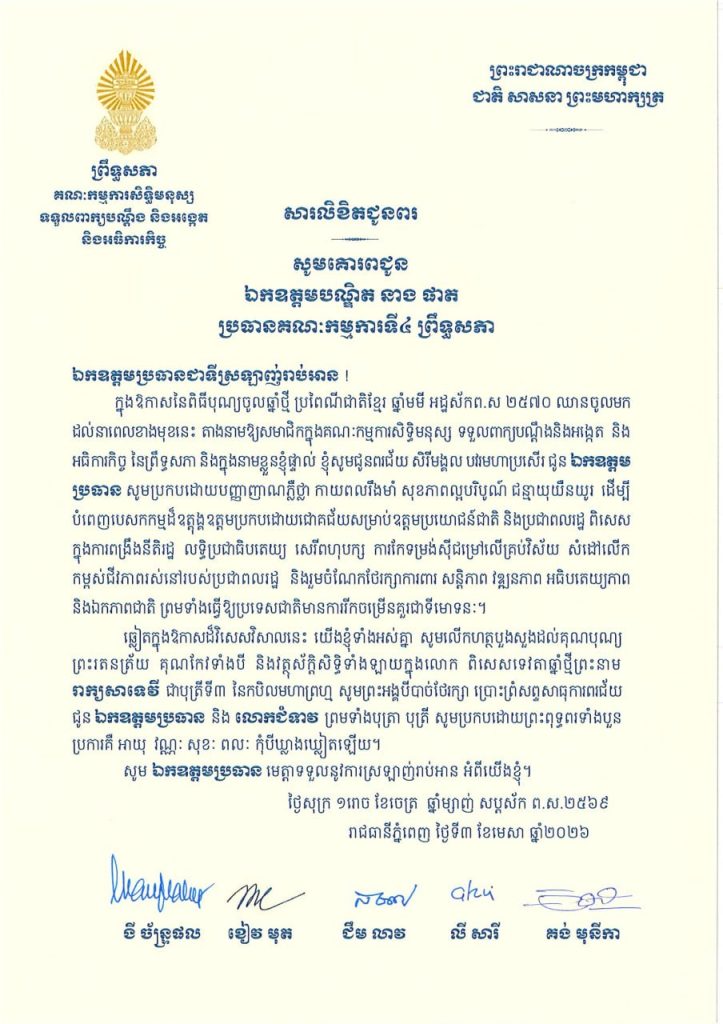 សារលិខិតជូនពររបស់ សមាជិក សមាជិកាគណៈកម្មការទី១ព្រឹទ្ធសភា ក្នុងឱកាសនៃពិធីបុណ្យចូលឆ្នាំថ្មី ប្រពៃណីជាតិខ្មែរ ឆ្នាំមមី អដ្ឋស័កព.ស.២៥៧០ ឈានចូលមកដល់នាពេលខាងមុខនេះ គោរពជូន៖១-សម្តេចមហាបវរធិបតី ហ៊ុន ម៉ាណែត នាយករដ្ឋមន្ត្រី នៃព្រះរាជាណាចក្រកម្ពុជា២-លោកជំទាវបណ្ឌិត ពេជ ចន្ទមុន្នី ហ៊ុន ម៉ាណែត អគ្គស្នងការនៃសមាគមកាយឫទ្ធិនារីកម្ពុជា៣-ឯកឧត្តមសន្តិបណ្ឌិត នេត សាវឿន ឧបនាយករដ្ឋមន្ត្រី និងជាប្រធានអាជ្ញាធរជាតិប្រយុទ្ធប្រឆាំងគ្រឿងញៀន៤-ឯកឧត្តមអភិសន្តិបណ្ឌិត ស សុខា ឧបនាយករដ្ឋមន្ត្រី រដ្ឋមន្ត្រីក្រសួងមហាផ្ទៃ៥-ឯកឧត្តម ប្រាក់ សុខុន ឧបនាយករដ្ឋមន្ត្រី រដ្ឋមន្ត្រីក្រសួងការបរទេស និងសហប្រតិបត្តិការអន្តរជាតិ៦-ឯកឧត្តម ហ៊ុន ម៉ានី ឧបនាយករដ្ឋមន្ត្រី រដ្ឋមន្ត្រីក្រសួងមុខងារសាធារណៈ៧-ឯកឧត្តម កើត រិទ្ធ ឧបនាយករដ្ឋមន្ត្រី រដ្ឋមន្ត្រីក្រសួងយុត្តិធម៌៨-ឯកឧត្តម សាយ សំអាល់ ឧបនាយករដ្ឋមន្ត្រី រដ្ឋមន្ត្រីក្រសួងរៀបចំដែនដី នគរូបនីយកម្ម និងសំណង់៩-ឯកឧត្តមនាយឧត្តមសេនីយ៍ ទៀ សីហា ឧបនាយករដ្ឋមន្ត្រី រដ្ឋមន្ត្រីក្រសួងការពារជាតិ១០-ឯកឧត្តមទេសរដ្ឋមន្ត្រី គី តិច ប្រធានក្រុមមេធាវីស្ម័គ្រចិត្តសម្តេចតេជោសែន១១-ឯកឧត្តមទេសរដ្ឋមន្ត្រី កែវ រ៉េមី ប្រធានគណៈកម្មាធិការសិទ្ធិមនុស្សកម្ពុជា១២-លោកជំទាវកិត្តិបណ្ឌិត អ៊ឹង កន្ថាផាវី រដ្ឋមន្ត្រីក្រសួងកិច្ចការនារី១៣-ឯកឧត្តម សុខ សូកេន រដ្ឋមន្ត្រីក្រសួងអធិការកិច្ច១៤-ឯកឧត្តម នេត ភក្ត្រា រដ្ឋមន្ត្រីក្រសួងព័ត៌មាន