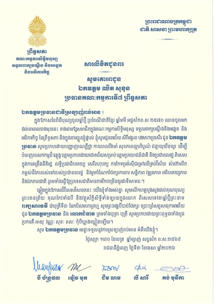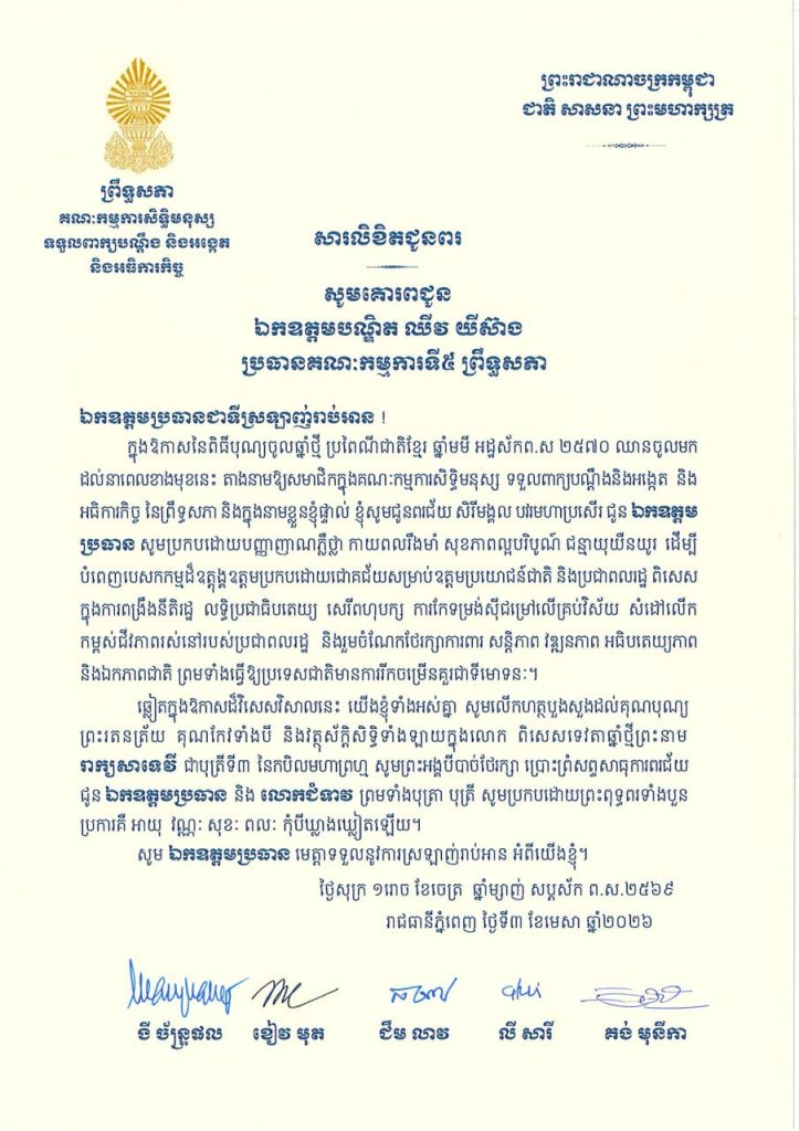 សារលិខិតជូនពររបស់ សមាជិក សមាជិកាគណៈកម្មការទី១ព្រឹទ្ធសភា ក្នុងឱកាសនៃពិធីបុណ្យចូលឆ្នាំថ្មី ប្រពៃណីជាតិខ្មែរ ឆ្នាំមមី អដ្ឋស័កព.ស.២៥៧០ ឈានចូលមកដល់នាពេលខាងមុខនេះ គោរពជូន៖១-សម្តេចមហារដ្ឋសភាធិការធិបតី ឃួន សុដារី ប្រធានរដ្ឋសភា នៃព្រះរាជាណាចក្រកម្ពុជា២-ឯកឧត្តមកិត្តិសេដ្ឋាបណ្ឌិត ជាម យៀប អនុប្រធានទី១រដ្ឋសភា នៃព្រះរាជាណាចក្រកម្ពុជា៣-ឯកឧត្តម វង សូត អនុប្រធានទី២រដ្ឋសភា នៃព្រះរាជាណាចក្រកម្ពុជា៤-ឯកឧត្តម សរ ចំរុង ប្រធានគណៈកម្មការទី១ នៃរដ្ឋសភា៥-ឯកឧត្តម ឈាង វុន ប្រធានគណៈកម្មការទី២ នៃរដ្ឋសភា៦-ឯកឧត្តមសន្តិបណ្ឌិត ឡូយ សុផាត ប្រធានគណៈកម្មការទី៣ នៃរដ្ឋសភា៧-ឯកឧត្តម កែប ជុតិមា ប្រធានគណៈកម្មការទី៤ នៃរដ្ឋសភា៨-ឯកឧត្តម សួស យ៉ារ៉ា ប្រធានគណៈកម្មការទី៥ នៃរដ្ឋសភា៩-ឯកឧត្តម អង្គ វង្ស វឌ្ឍនា ប្រធានគណៈកម្មការទី៦ នៃរដ្ឋសភា១០-ឯកឧត្តម ប៉ា សុជាតិវង្ស ប្រធានគណៈកម្មការទី៧ នៃរដ្ឋសភា១១-លោកជំទាវ ឡោក ខេង ប្រធានគណៈកម្មការទី៨ នៃរដ្ឋសភា១២-លោកជំទាវ និន សាផុន ប្រធានគណៈកម្មការទី៩ នៃរដ្ឋសភា១៣-ឯកឧត្តមបណ្ឌិត ប៉ែន ស៊ីម៉ន ប្រធានគណៈកម្មការទី១០ នៃរដ្ឋសភា