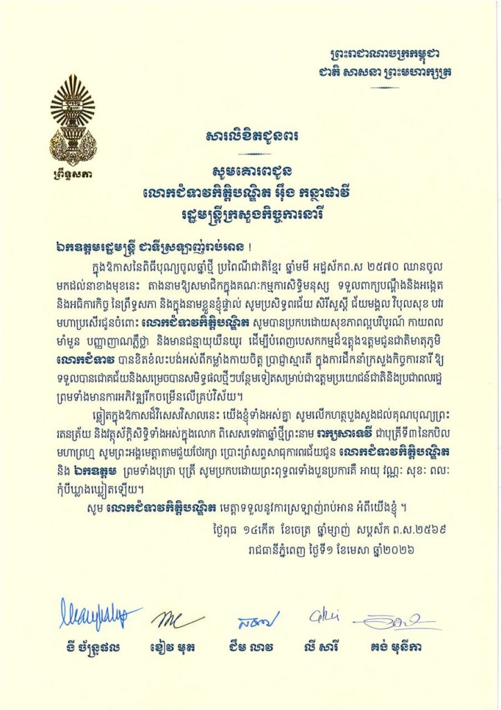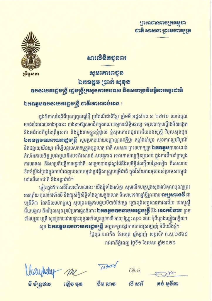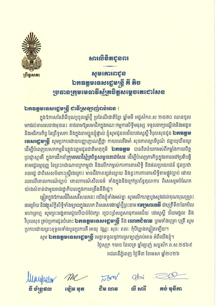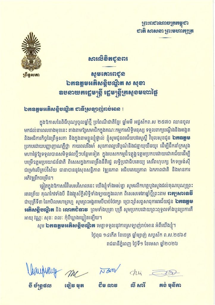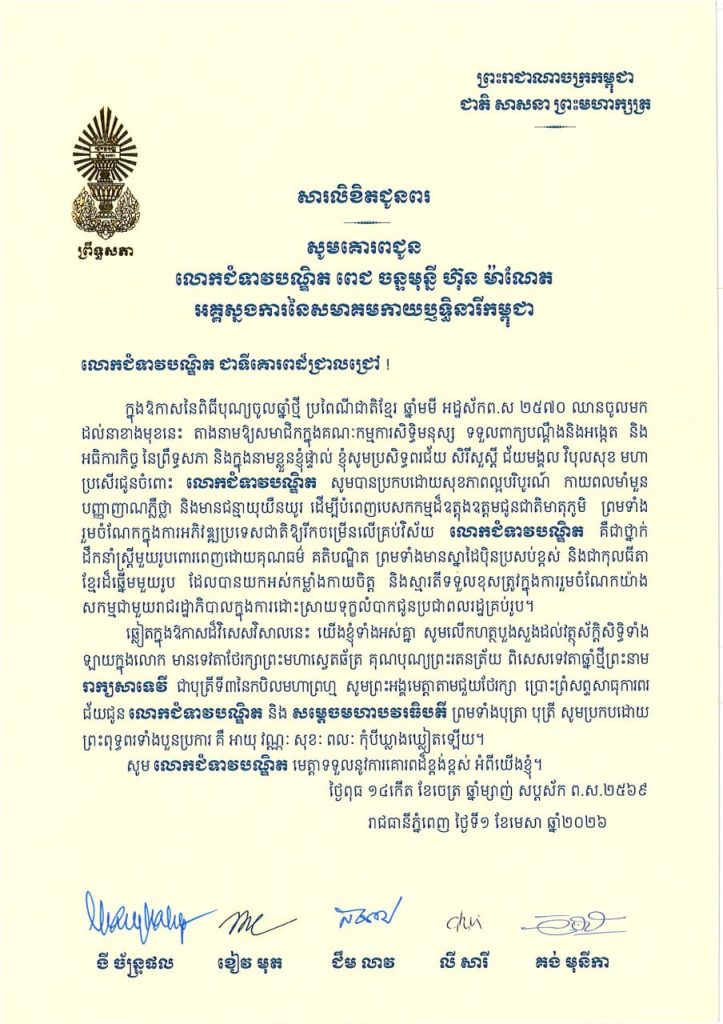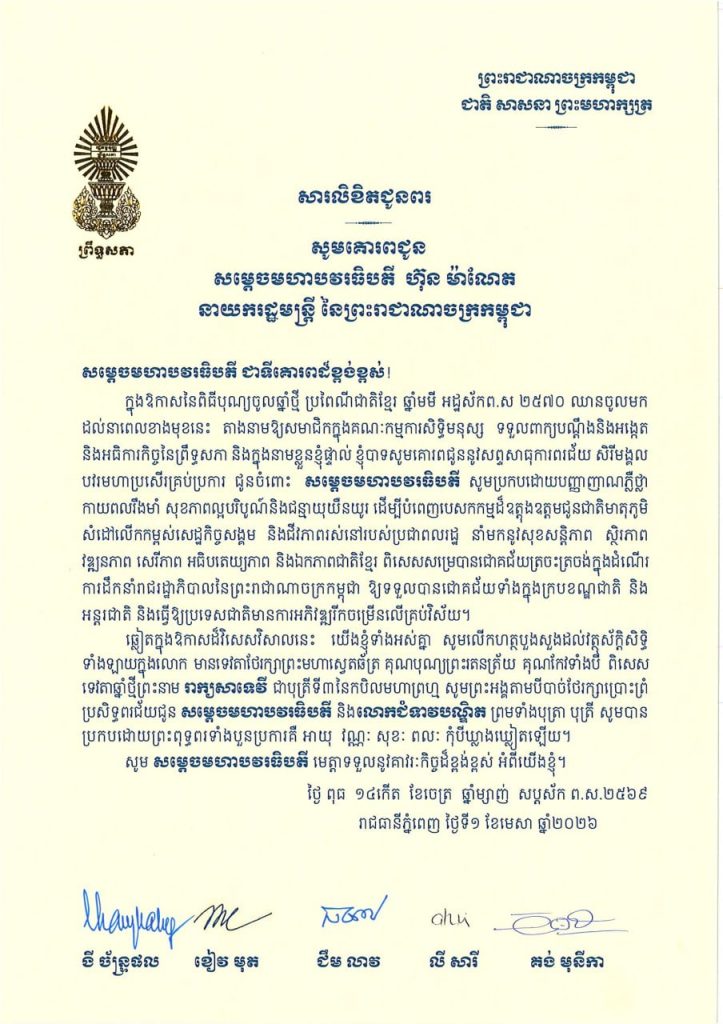សារលិខិតជូនពររបស់ សមាជិក សមាជិកាគណៈកម្មការទី១ព្រឹទ្ធសភា ក្នុងឱកាសនៃពិធីបុណ្យចូលឆ្នាំថ្មី ប្រពៃណីជាតិខ្មែរ ឆ្នាំមមី អដ្ឋស័កព.ស.២៥៧០ ឈានចូលមកដល់នាពេលខាងមុខនេះ គោរពជូន៖១-សម្តេចអគ្គមហាសេនាបតីតេជោ ហ៊ុន សែន ប្រមុខរដ្ឋស្តីទី នៃព្រះរាជាណាចក្រកម្ពុជា២-សម្តេចកិត្តិព្រឹទ្ធបណ្ឌិត ប៊ុន រ៉ានី ហ៊ុនសែន ប្រធានកាកបាទក្រហមកម្ពុជា៣-ឯកឧត្តម អ៊ុច បូររិទ្ធ ប្រធានស្តីទីព្រឹទ្ធសភា នៃព្រះរាជាណាចក្រកម្ពុជា៤-ឯកឧត្តមបណ្ឌិត ធន់ វឌ្ឍនា អនុប្រធានទី២ព្រឹទ្ធសភា នៃព្រះរាជាណាចក្រកម្ពុជា៥-ឯកឧត្តម យស ផានីត្តា ប្រធានគណៈកម្មការទី២ ព្រឹទ្ធសភា៦-ឯកឧត្តមបណ្ឌិត ម៉ុង ឫទ្ធី ប្រធានគណៈកម្មការទី៣ ព្រឹទ្ធសភា៧-ឯកឧត្តមបណ្ឌិត នាង ផាត ប្រធានគណៈកម្មការទី៤ ព្រឹទ្ធសភា៨-ឯកឧត្តមបណ្ឌិត ឈីវ យីស៊ាង ប្រធានគណៈកម្មការទី៥ ព្រឹទ្ធសភា៩-លោកជំទាវបណ្ឌិត ចាន់ សុទ្ធាវី ប្រធានគណៈកម្មការទី៦ ព្រឹទ្ធសភា១០-ឯកឧត្តម ឈិត សុខុន ប្រធានគណៈកម្មការទី៧ ព្រឹទ្ធសភា១១-លោកជំទាវ មាន សំអាន ប្រធានគណៈកម្មការទី៨ ព្រឹទ្ធសភា១២-ឯកឧត្តម អ៊ុ សារឹទ្ធ ប្រធានគណៈកម្មការទី៩ ព្រឹទ្ធសភា១៣-ឯកឧត្តម ម៉ម ប៊ុននាង ប្រធានគណៈកម្មការទី១០ ព្រឹទ្ធសភា