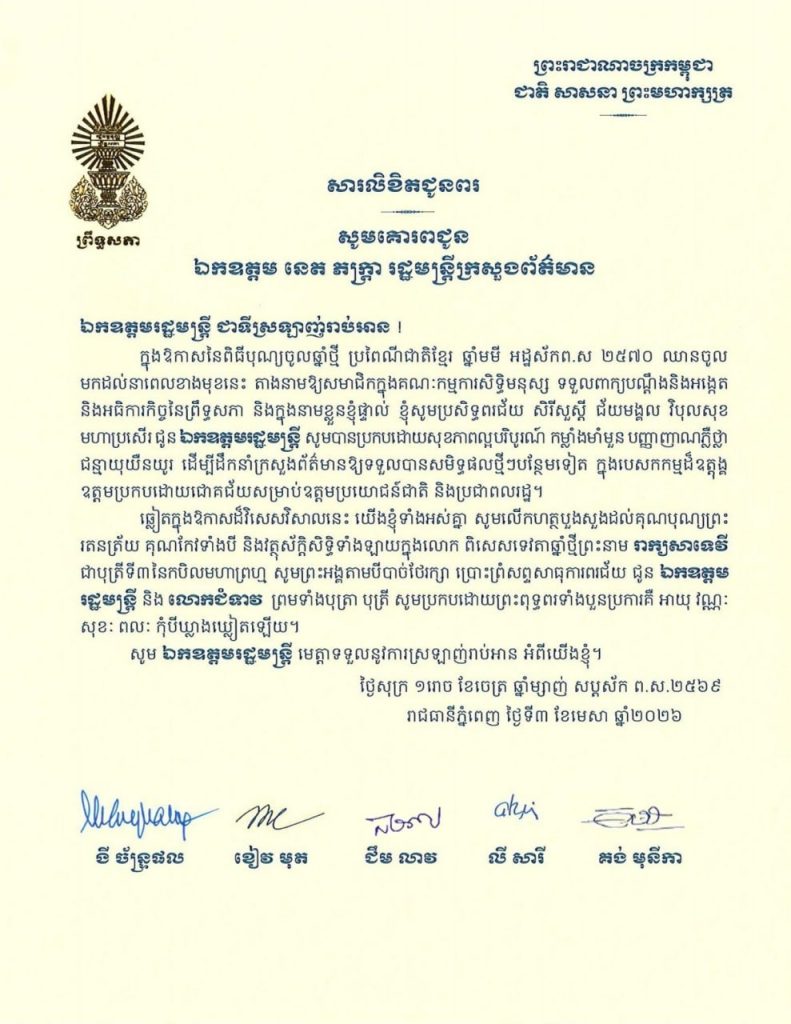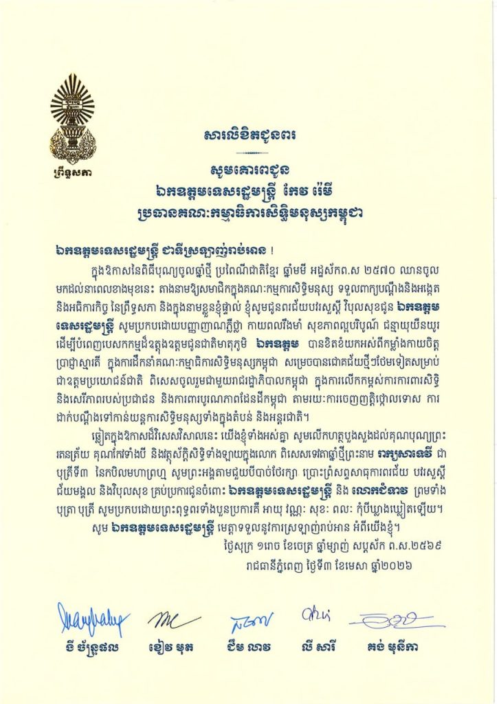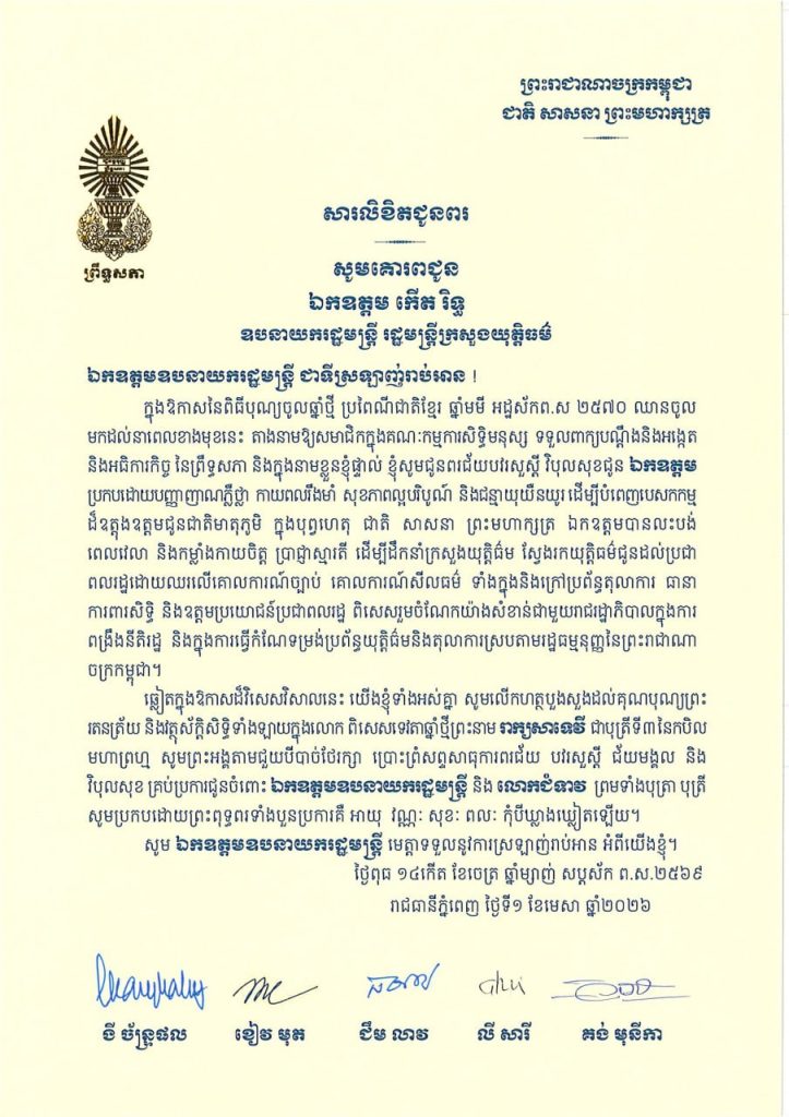 • សារលិខិតជូនពររបស់ សមាជិក សមាជិកាគណៈកម្មការទី១ព្រឹទ្ធសភា ក្នុងឱកាសនៃពិធីបុណ្យចូលឆ្នាំថ្មី ប្រពៃណីជាតិខ្មែរ ឆ្នាំមមី អដ្ឋស័កព.ស.២៥៧០ ឈានចូលមកដល់នាពេលខាងមុខនេះ គោរពជូន៖១-សម្តេចមហាបវរធិបតី ហ៊ុន ម៉ាណែត នាយករដ្ឋមន្ត្រី នៃព្រះរាជាណាចក្រកម្ពុជា២-លោកជំទាវបណ្ឌិត ពេជ ចន្ទមុន្នី ហ៊ុន ម៉ាណែត អគ្គស្នងការនៃសមាគមកាយឫទ្ធិនារីកម្ពុជា៣-ឯកឧត្តមសន្តិបណ្ឌិត នេត សាវឿន ឧបនាយករដ្ឋមន្ត្រី និងជាប្រធានអាជ្ញាធរជាតិប្រយុទ្ធប្រឆាំងគ្រឿងញៀន៤-ឯកឧត្តមអភិសន្តិបណ្ឌិត ស សុខា ឧបនាយករដ្ឋមន្ត្រី រដ្ឋមន្ត្រីក្រសួងមហាផ្ទៃ៥-ឯកឧត្តម ប្រាក់ សុខុន ឧបនាយករដ្ឋមន្ត្រី រដ្ឋមន្ត្រីក្រសួងការបរទេស និងសហប្រតិបត្តិការអន្តរជាតិ៦-ឯកឧត្តម ហ៊ុន ម៉ានី ឧបនាយករដ្ឋមន្ត្រី រដ្ឋមន្ត្រីក្រសួងមុខងារសាធារណៈ៧-ឯកឧត្តម កើត រិទ្ធ ឧបនាយករដ្ឋមន្ត្រី រដ្ឋមន្ត្រីក្រសួងយុត្តិធម៌៨-ឯកឧត្តម សាយ សំអាល់ ឧបនាយករដ្ឋមន្ត្រី រដ្ឋមន្ត្រីក្រសួងរៀបចំដែនដី នគរូបនីយកម្ម និងសំណង់៩-ឯកឧត្តមនាយឧត្តមសេនីយ៍ ទៀ សីហា ឧបនាយករដ្ឋមន្ត្រី រដ្ឋមន្ត្រីក្រសួងការពារជាតិ១០-ឯកឧត្តមទេសរដ្ឋមន្ត្រី គី តិច ប្រធានក្រុមមេធាវីស្ម័គ្រចិត្តសម្តេចតេជោសែន១១-ឯកឧត្តមទេសរដ្ឋមន្ត្រី កែវ រ៉េមី ប្រធានគណៈកម្មាធិការសិទ្ធិមនុស្សកម្ពុជា១២-លោកជំទាវកិត្តិបណ្ឌិត អ៊ឹង កន្ថាផាវី រដ្ឋមន្ត្រីក្រសួងកិច្ចការនារី១៣-ឯកឧត្តម សុខ សូកេន រដ្ឋមន្ត្រីក្រសួងអធិការកិច្ច១៤-ឯកឧត្តម នេត ភក្ត្រា រដ្ឋមន្ត្រីក្រសួងព័ត៌មាន