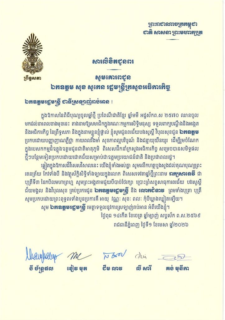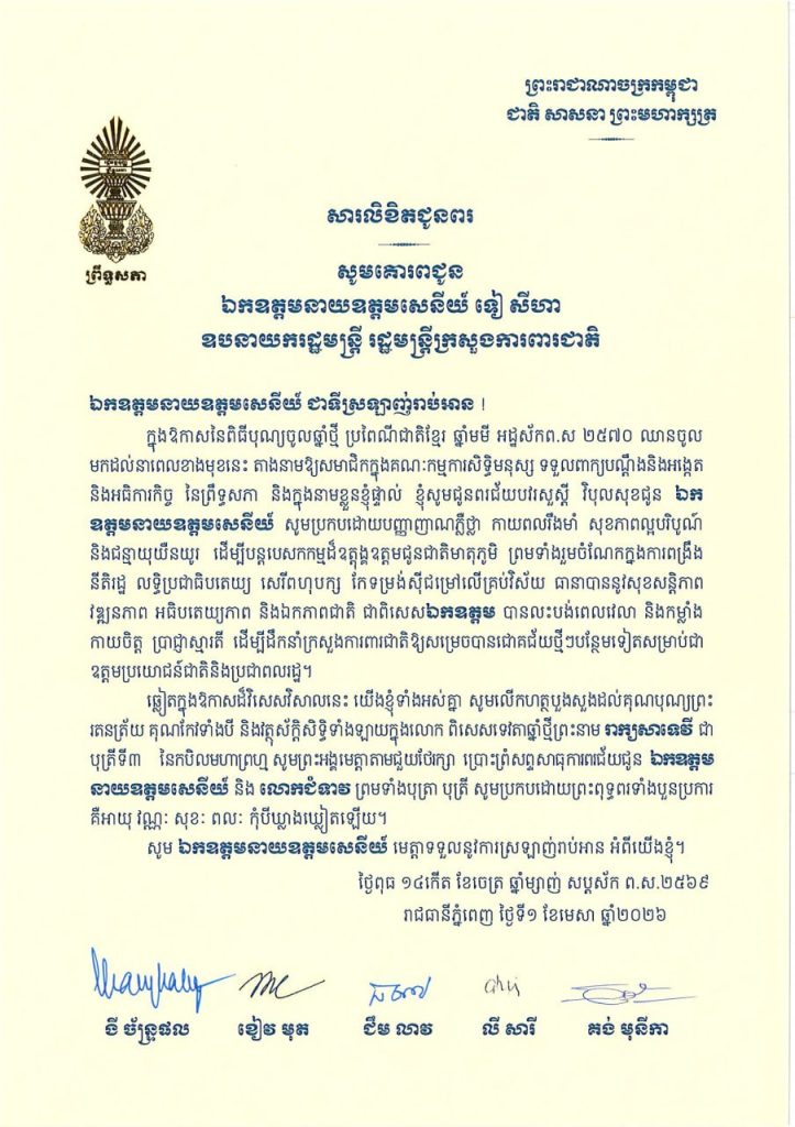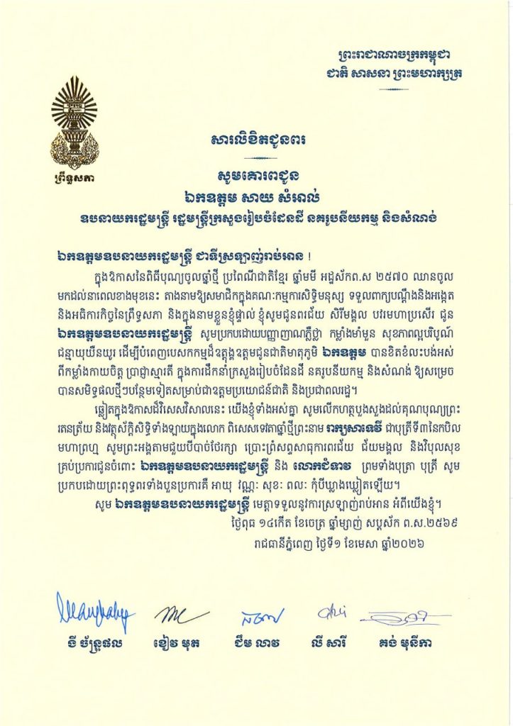សារលិខិតជូនពររបស់ សមាជិក សមាជិកាគណៈកម្មការទី១ព្រឹទ្ធសភា ក្នុងឱកាសនៃពិធីបុណ្យចូលឆ្នាំថ្មី ប្រពៃណីជាតិខ្មែរ ឆ្នាំមមី អដ្ឋស័កព.ស.២៥៧០ ឈានចូលមកដល់នាពេលខាងមុខនេះ គោរពជូន៖១-សម្តេចមហារដ្ឋសភាធិការធិបតី ឃួន សុដារី ប្រធានរដ្ឋសភា នៃព្រះរាជាណាចក្រកម្ពុជា២-ឯកឧត្តមកិត្តិសេដ្ឋាបណ្ឌិត ជាម យៀប អនុប្រធានទី១រដ្ឋសភា នៃព្រះរាជាណាចក្រកម្ពុជា៣-ឯកឧត្តម វង សូត អនុប្រធានទី២រដ្ឋសភា នៃព្រះរាជាណាចក្រកម្ពុជា៤-ឯកឧត្តម សរ ចំរុង ប្រធានគណៈកម្មការទី១ នៃរដ្ឋសភា៥-ឯកឧត្តម ឈាង វុន ប្រធានគណៈកម្មការទី២ នៃរដ្ឋសភា៦-ឯកឧត្តមសន្តិបណ្ឌិត ឡូយ សុផាត ប្រធានគណៈកម្មការទី៣ នៃរដ្ឋសភា៧-ឯកឧត្តម កែប ជុតិមា ប្រធានគណៈកម្មការទី៤ នៃរដ្ឋសភា៨-ឯកឧត្តម សួស យ៉ារ៉ា ប្រធានគណៈកម្មការទី៥ នៃរដ្ឋសភា៩-ឯកឧត្តម អង្គ វង្ស វឌ្ឍនា ប្រធានគណៈកម្មការទី៦ នៃរដ្ឋសភា១០-ឯកឧត្តម ប៉ា សុជាតិវង្ស ប្រធានគណៈកម្មការទី៧ នៃរដ្ឋសភា១១-លោកជំទាវ ឡោក ខេង ប្រធានគណៈកម្មការទី៨ នៃរដ្ឋសភា១២-លោកជំទាវ និន សាផុន ប្រធានគណៈកម្មការទី៩ នៃរដ្ឋសភា១៣-ឯកឧត្តមបណ្ឌិត ប៉ែន ស៊ីម៉ន ប្រធានគណៈកម្មការទី១០ នៃរដ្ឋសភា