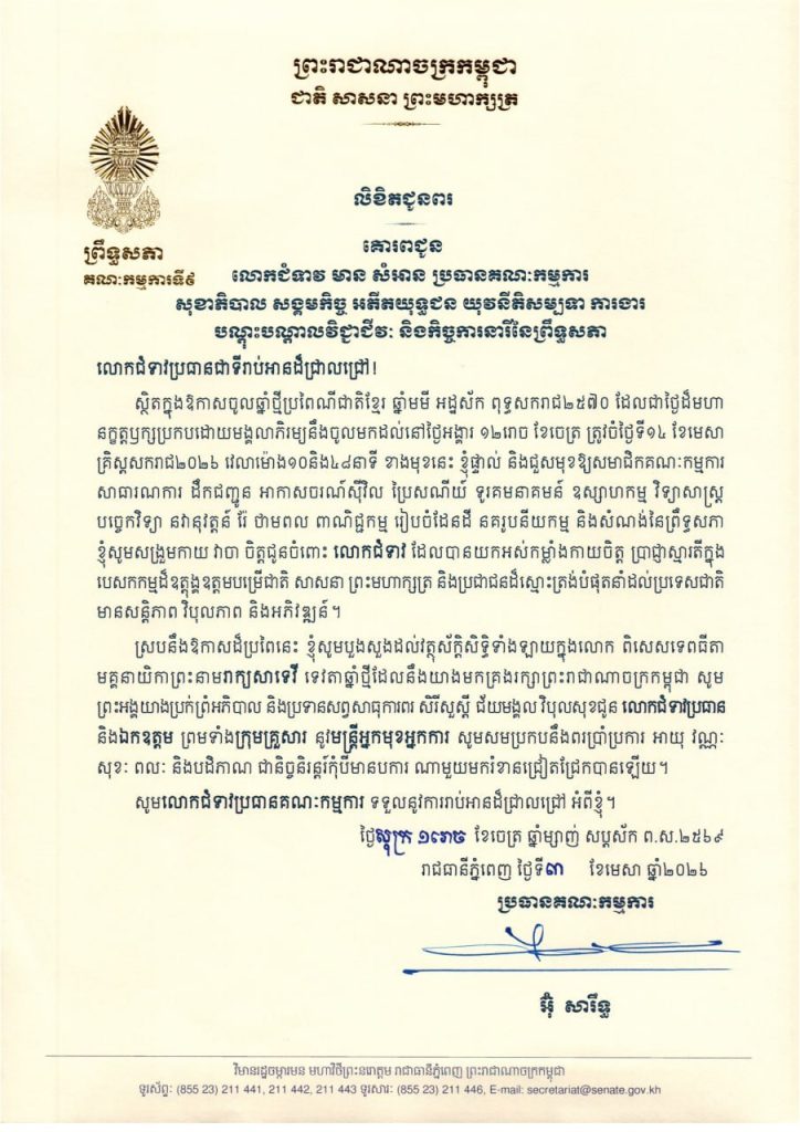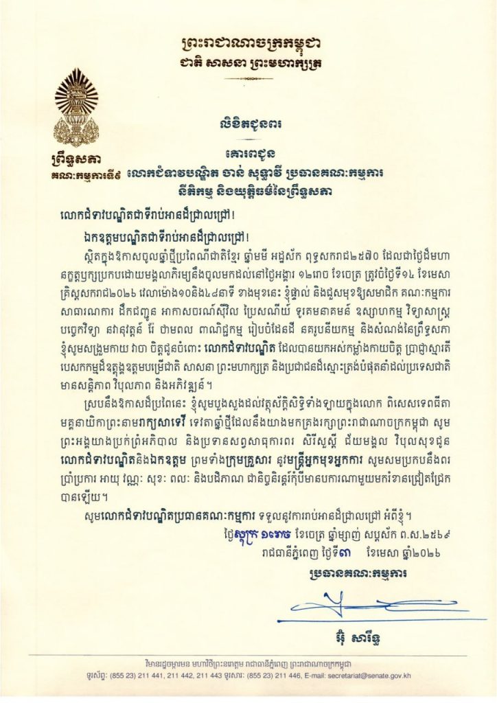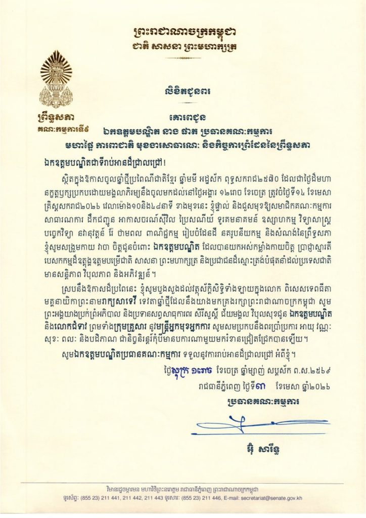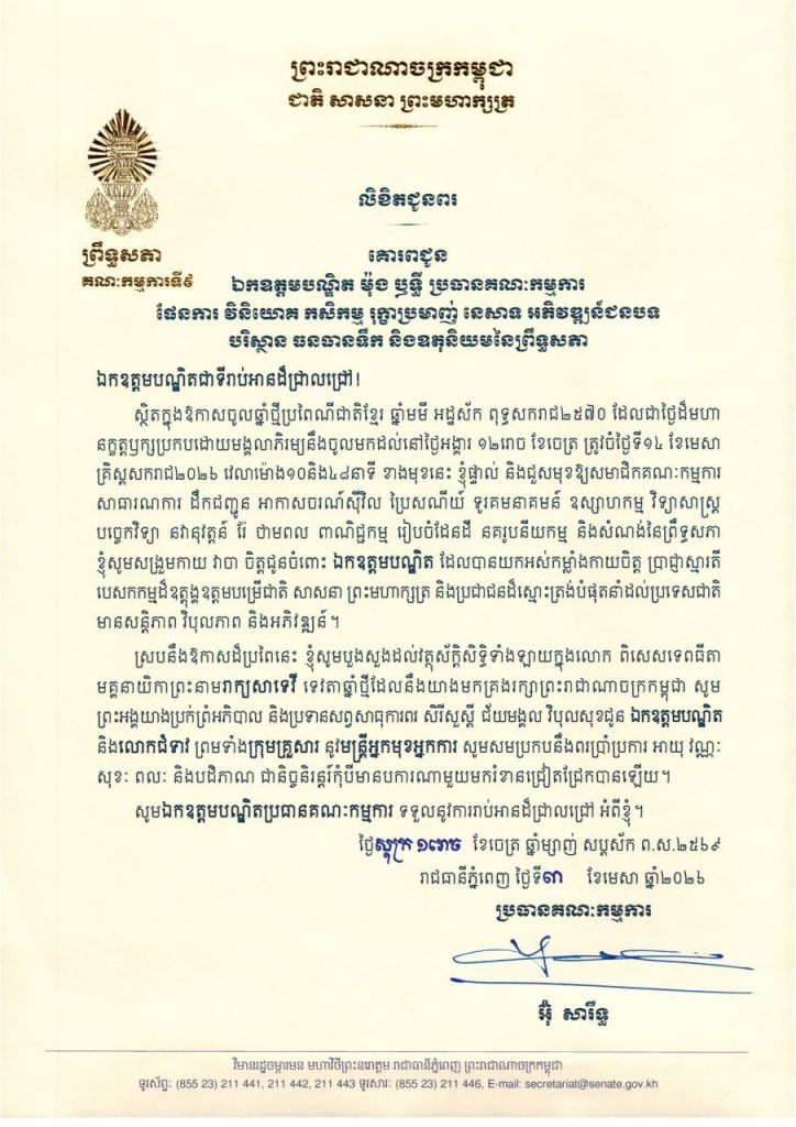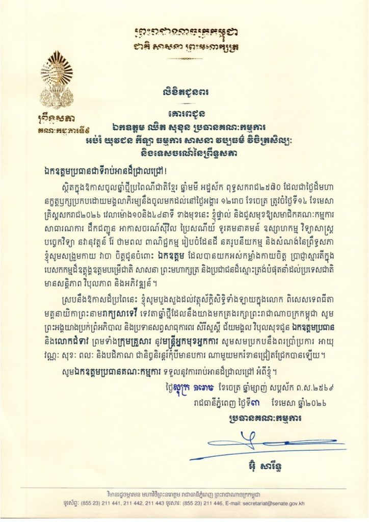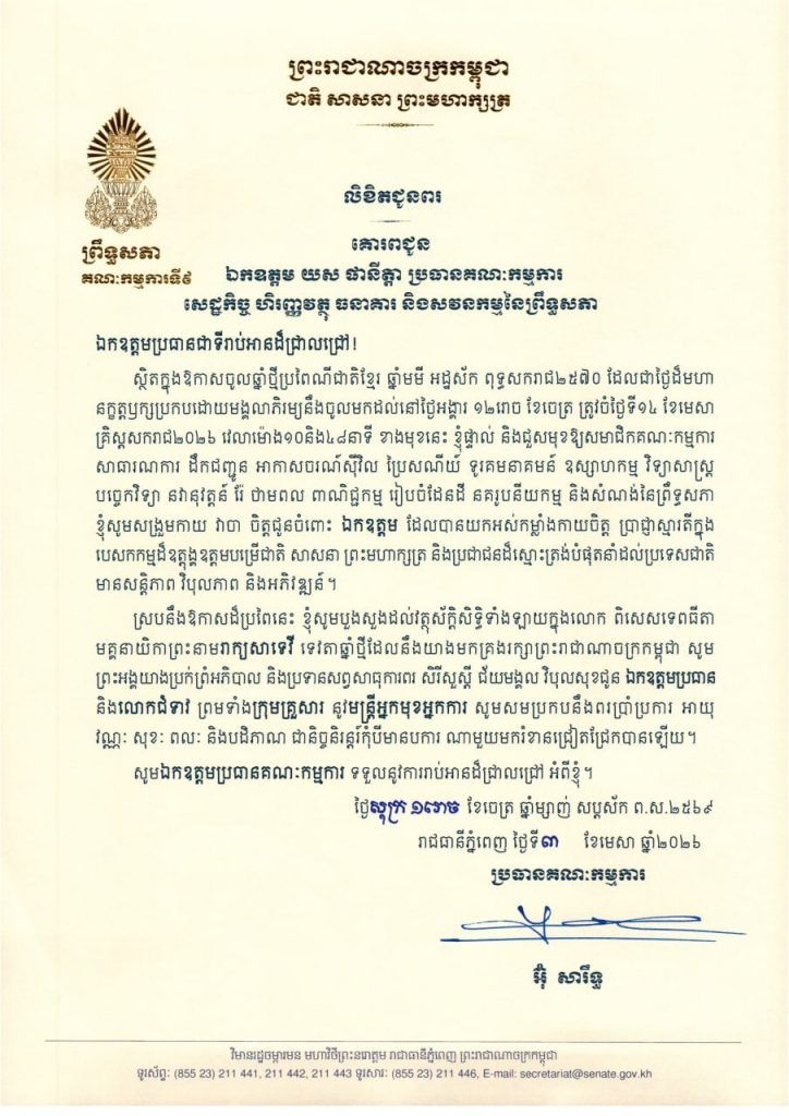 លិខិតជូនពររបស់ឯកឧត្តម អ៊ុ សារឹទ្ធ ប្រធានគណៈកម្មការទី៩ព្រឹទ្ធសភា គោរពជូន ថ្នាក់ដឹកនាំ និងប្រធានគណៈកម្មការនានា នៃព្រឹទ្ធសភា ក្នុងឱកាសចូលឆ្នាំថ្មីប្រពៃណីជាតិខ្មែរ ឆ្នាំមមី អដ្ឋស័ក ពុទ្ធសករាជ២៥៧០ ដែលជាថ្ងៃដ៏មហា នក្ខត្តឫក្សប្រកបដោយមង្គលាភិរម្យនឹងចូលមកដល់នៅថ្ងៃអង្គារ ១២រោច ខែចេត្រ ត្រូវចំថ្ងៃទី១៤ ខែមេសា គ្រិស្តសករាជ២០២៦ ខាងមុខនេះ