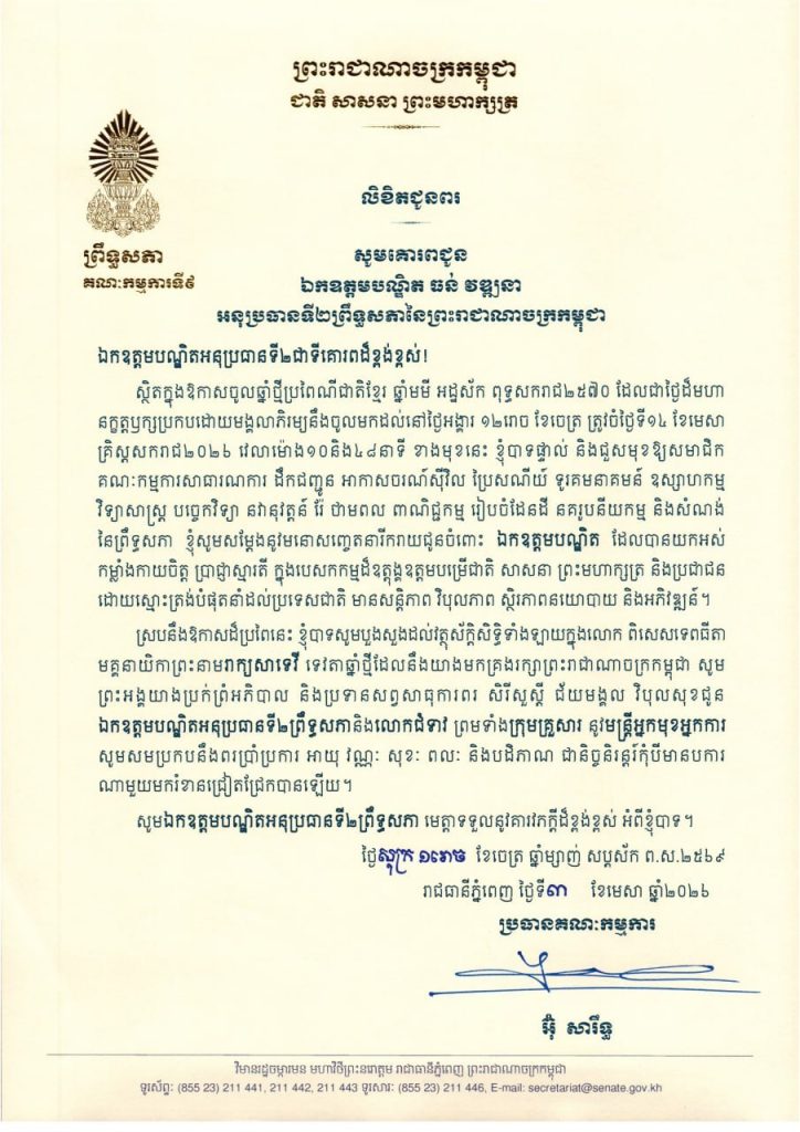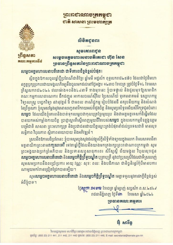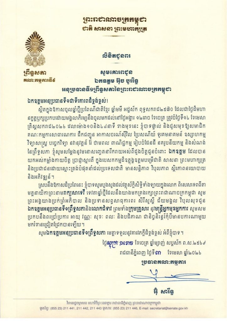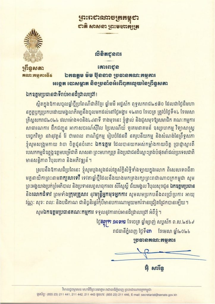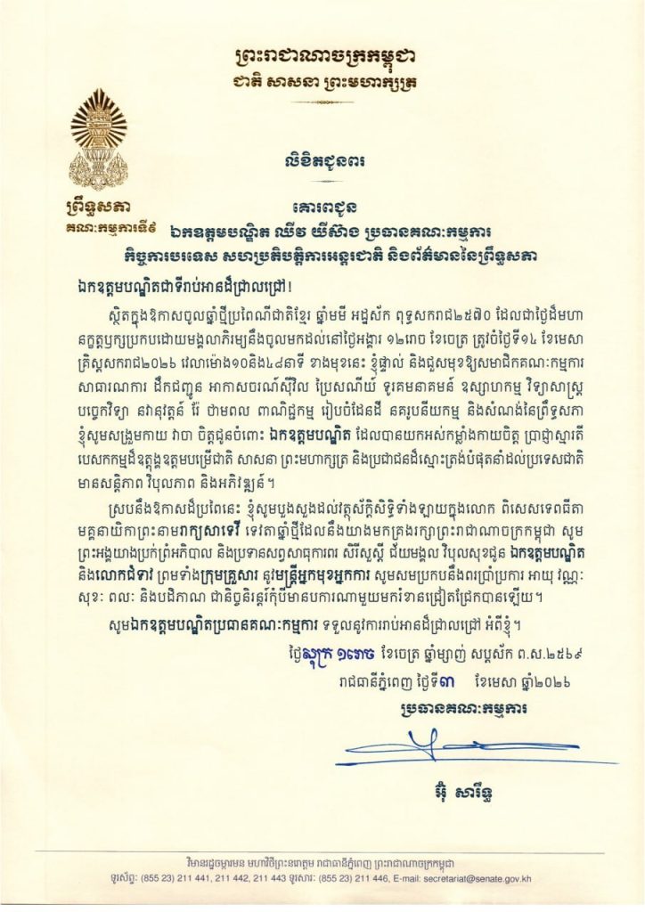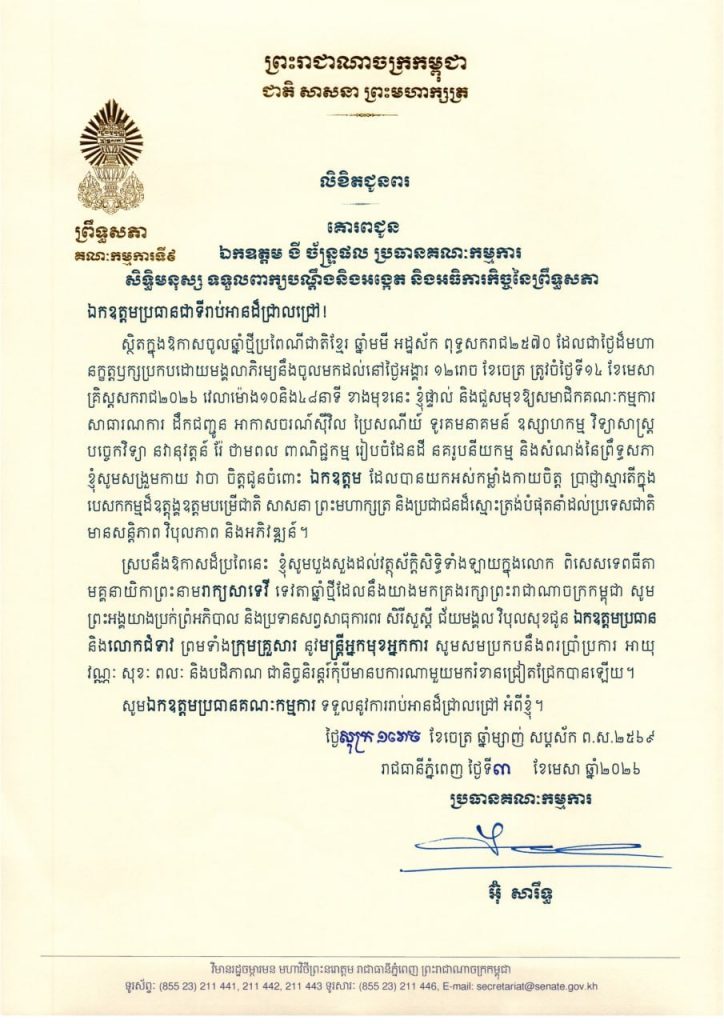 លិខិតជូនពររបស់ឯកឧត្តម អ៊ុ សារឹទ្ធ ប្រធានគណៈកម្មការទី៩ព្រឹទ្ធសភា គោរពជូន ថ្នាក់ដឹកនាំ និងប្រធានគណៈកម្មការនានា នៃព្រឹទ្ធសភា ក្នុងឱកាសចូលឆ្នាំថ្មីប្រពៃណីជាតិខ្មែរ ឆ្នាំមមី អដ្ឋស័ក ពុទ្ធសករាជ២៥៧០ ដែលជាថ្ងៃដ៏មហា នក្ខត្តឫក្សប្រកបដោយមង្គលាភិរម្យនឹងចូលមកដល់នៅថ្ងៃអង្គារ ១២រោច ខែចេត្រ ត្រូវចំថ្ងៃទី១៤ ខែមេសា គ្រិស្តសករាជ២០២៦ ខាងមុខនេះ
