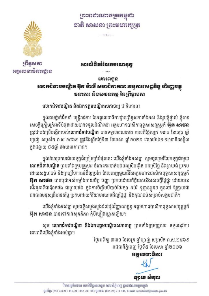 សារលិខិតរំលែកមរណទុក្ខរបស់ឯកឧត្តម ឡាយ សំកុល អគ្គលេខាធិការព្រឹទ្ធសភា គោរពជូន លោកជំទាវបណ្ឌិត អ៊ុក ម៉ាលី សមាជិកាគណៈកម្មការសេដ្ឋកិច្ច ហិរញ្ញវត្ថុ ធនាការ និងសវនកម្ម នៃព្រឹទ្ធសភា ចំពោះមរណភាពរបស់ អគ្គមហាឧបាសិកាពុទ្ធសាសនូត្ថម្ភក៍ អ៊ុក សាផន ត្រូវជាបងស្រីបង្កើតរបស់លោកជំទាវបណ្ឌិត បានទទួលមរណភាពកាលពីថ្ងៃសុក្រ ថ្ងៃទី៣ ខែមេសា ឆ្នាំ២០២៦ វេលាម៉ោង១:១២នាទីរសៀល ក្នុងជន្មាយុ ៨៥ឆ្នាំ ដោយរោគាពាធ។