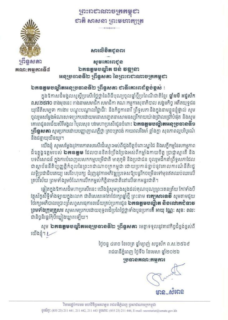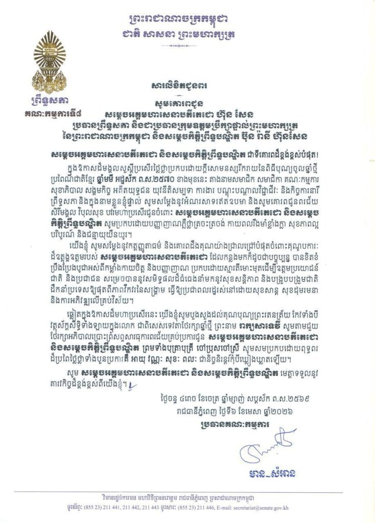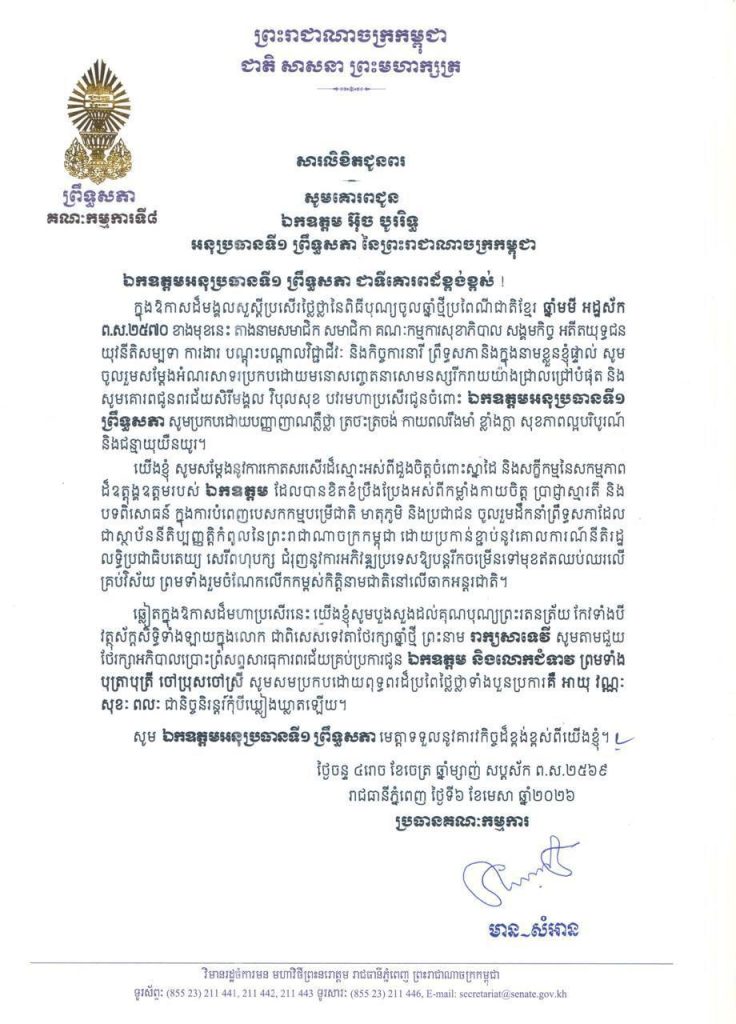 • សារលិខិតជូនពររបស់លោកជំទាវ​ មាន សំអាន ប្រធានគណៈកម្មការទី៨ព្រឹទ្ធសភា ក្នុងឱកាសដ៏មង្គលសួស្តីប្រសើរថ្លៃថ្លាប្រកបដោយក្តីសោមនស្សរីករាយនៃពិធីបុណ្យចូលឆ្នាំថ្មី ប្រពៃណីជាតិខ្មែរ ឆ្នាំមមី អដ្ឋស័ក ព.ស.២៥៧០ ខាងមុខនេះ គោរពជូន៖១-សម្តេចអគ្គមហាសេនាបតីតេជោ ហ៊ុន សែន ប្រធានព្រឹទ្ធសភា និងជាប្រធានក្រុមឧត្តមប្រឹក្សាផ្ទាល់ព្រះមហាក្សត្រ នៃព្រះរាជាណាចក្រកម្ពុជា និងសម្តេចកិត្តិព្រឹទ្ធបណ្ឌិត ប៊ុន រ៉ានី ហ៊ុនសែន២-ឯកឧត្តម អ៊ុច បូររិទ្ធ អនុប្រធានទី១ ព្រឹទ្ធសភា នៃព្រះរាជាណាចក្រកម្ពុជា៣-ឯកឧត្តមបណ្ឌិត ធន់ វឌ្ឍនា អនុប្រធានទី២ ព្រឹទ្ធសភា នៃព្រះរាជាណាចក្រកម្ពុជា