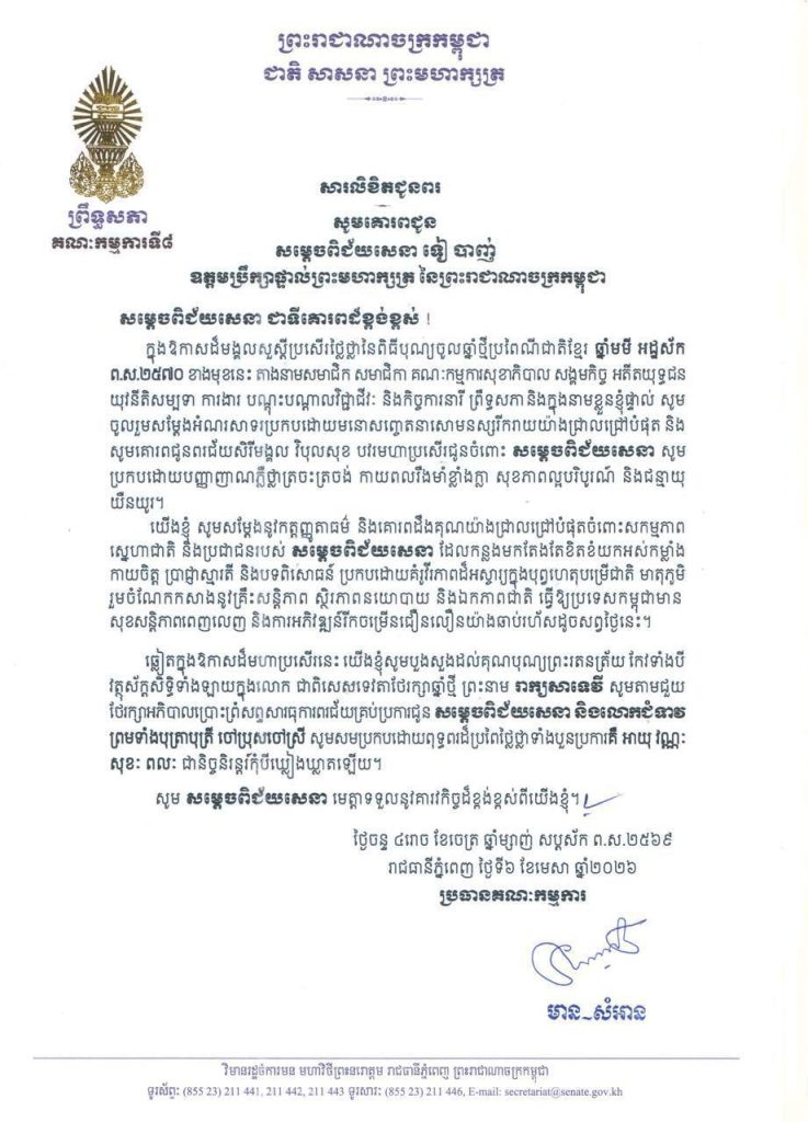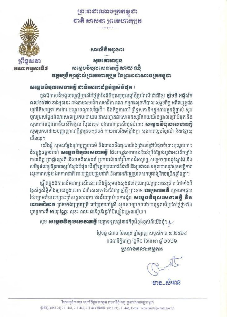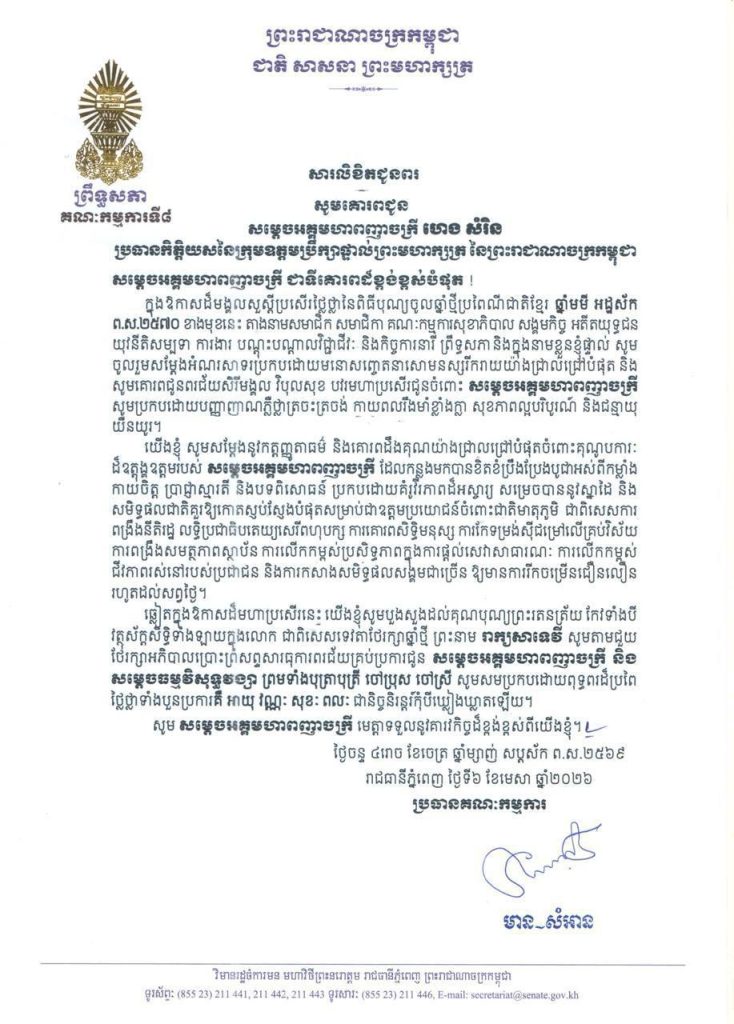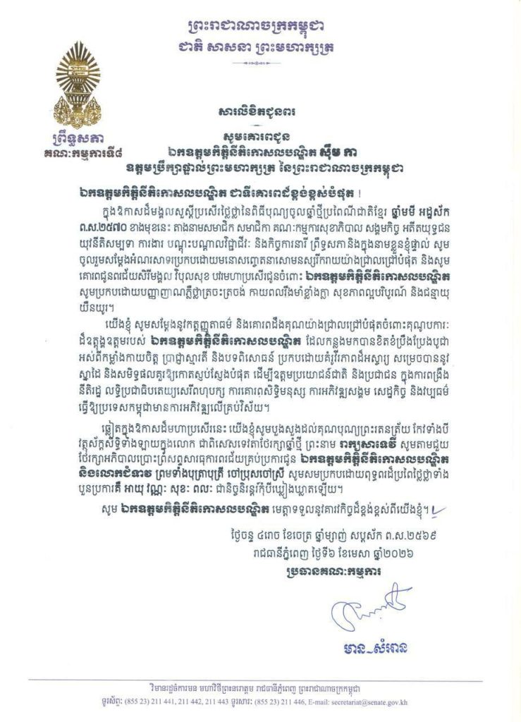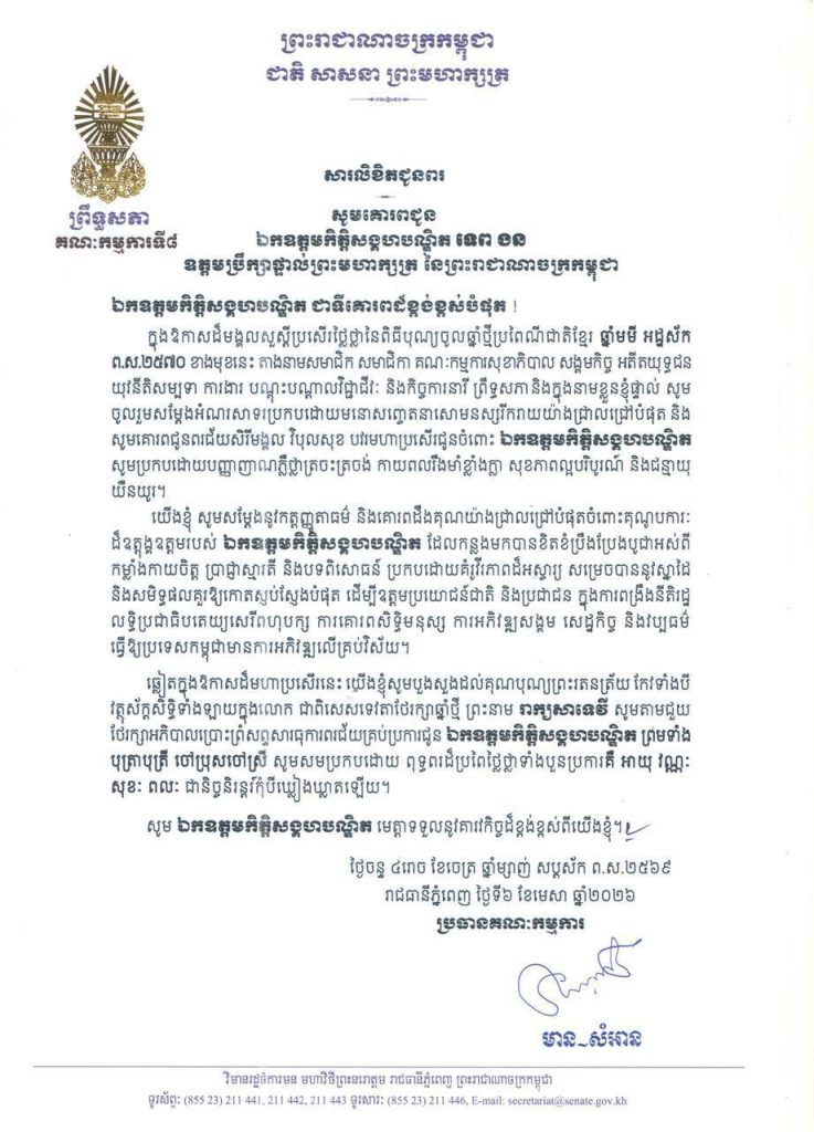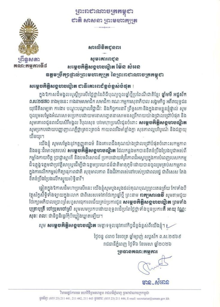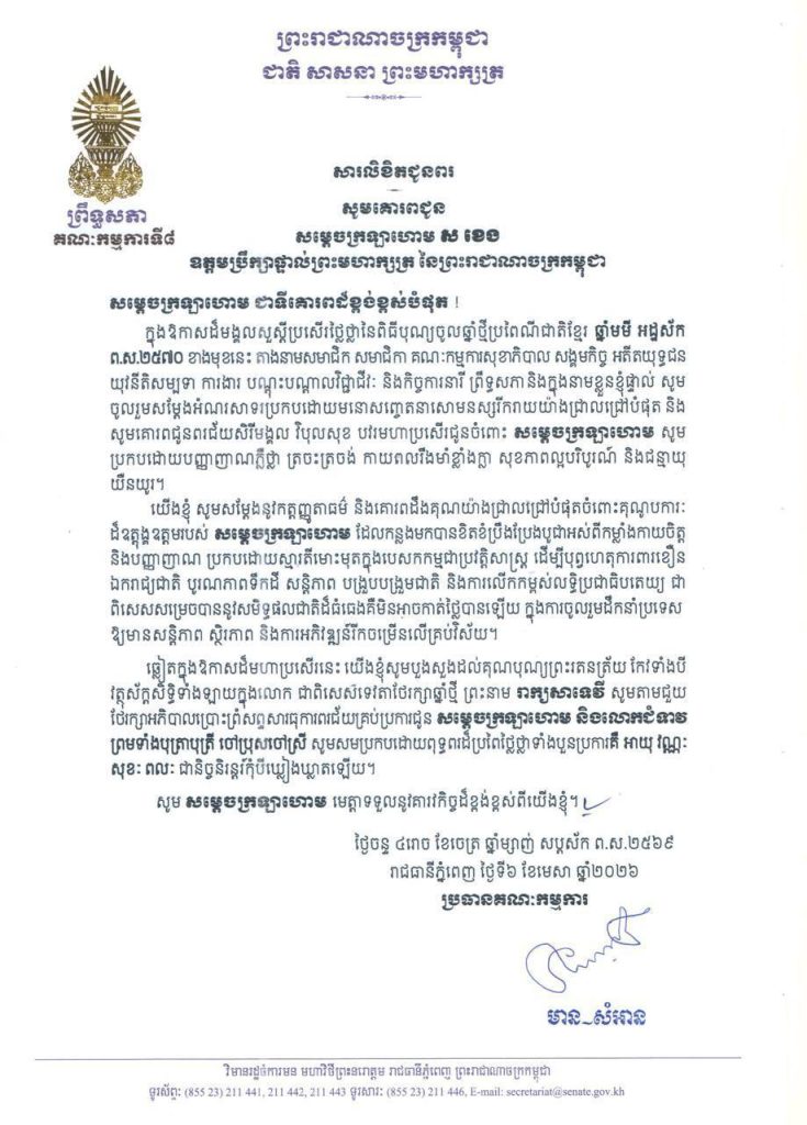 • សារលិខិតជូនពររបស់លោកជំទាវ​ មាន សំអាន ប្រធានគណៈកម្មការទី៨ព្រឹទ្ធសភា ក្នុងឱកាសដ៏មង្គលសួស្តីប្រសើរថ្លៃថ្លានៃពិធីបុណ្យចូលឆ្នាំថ្មីប្រពៃណីជាតិខ្មែរ ឆ្នាំមមី អដ្ឋស័ក ព.ស.២៥៧០ ខាងមុខនេះ គោរពជូន៖១-សម្តេចអគ្គមហាពញាចក្រី ហេង សំរិន ប្រធានកិត្តិយសនៃក្រុមឧត្តមប្រឹក្សាផ្ទាល់ព្រះមហាក្សត្រ នៃព្រះរាជាណាចក្រកម្ពុជា២-សម្តេចវិបុលសេនាភក្តី សាយ ឈុំ ឧត្តមប្រឹក្សាផ្ទាល់ព្រះមហាក្សត្រ នៃព្រះរាជាណាចក្រកម្ពុជា៣-សម្តេចក្រឡាហោម ស ខេង ឧត្តមប្រឹក្សាផ្ទាល់ព្រះមហាក្សត្រ នៃព្រះរាជាណាចក្រកម្ពុជា៤-សម្តេចពិជ័យសេនា ទៀ បាញ់ ឧត្តមប្រឹក្សាផ្ទាល់ព្រះមហាក្សត្រ នៃព្រះរាជាណាចក្រកម្ពុជា៥-សម្តេចកិត្តិសង្គហបណ្ឌិត ម៉ែន សំអន ឧត្តមប្រឹក្សាផ្ទាល់ព្រះមហាក្សត្រ នៃព្រះរាជាណាចក្រកម្ពុជា៦-ឯកឧត្តមកិត្តិនីតិកោសលបណ្ឌិត ស៊ឹម កា ឧត្តមប្រឹក្សាផ្ទាល់ព្រះមហាក្សត្រ នៃព្រះរាជាណាចក្រកម្ពុជា៧-ឯកឧត្តមកិត្តិសង្គហបណ្ឌិត ទេព ងន ឧត្តមប្រឹក្សាផ្ទាល់ព្រះមហាក្សត្រ នៃព្រះរាជាណាចក្រកម្ពុជា