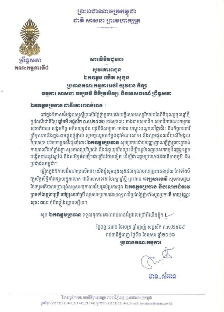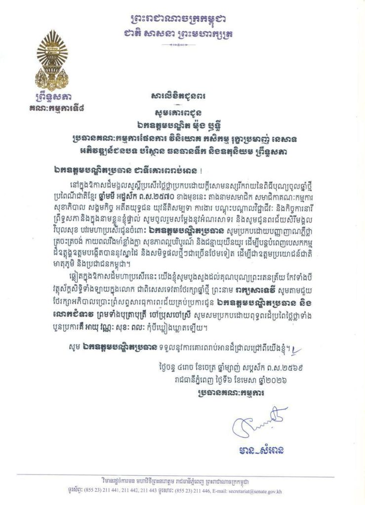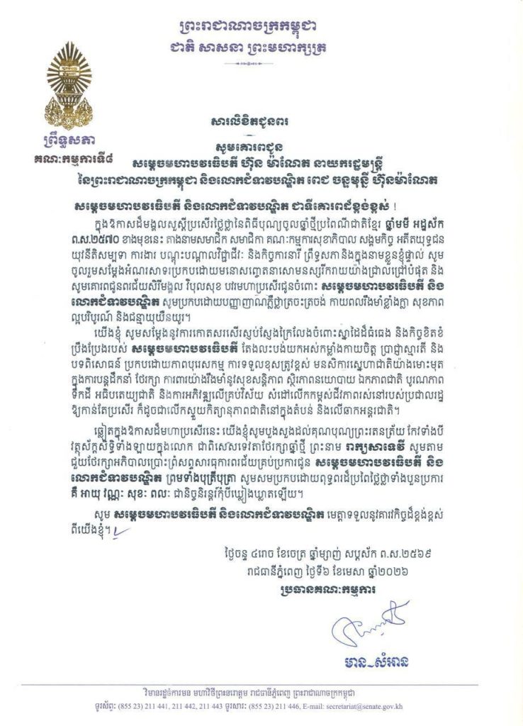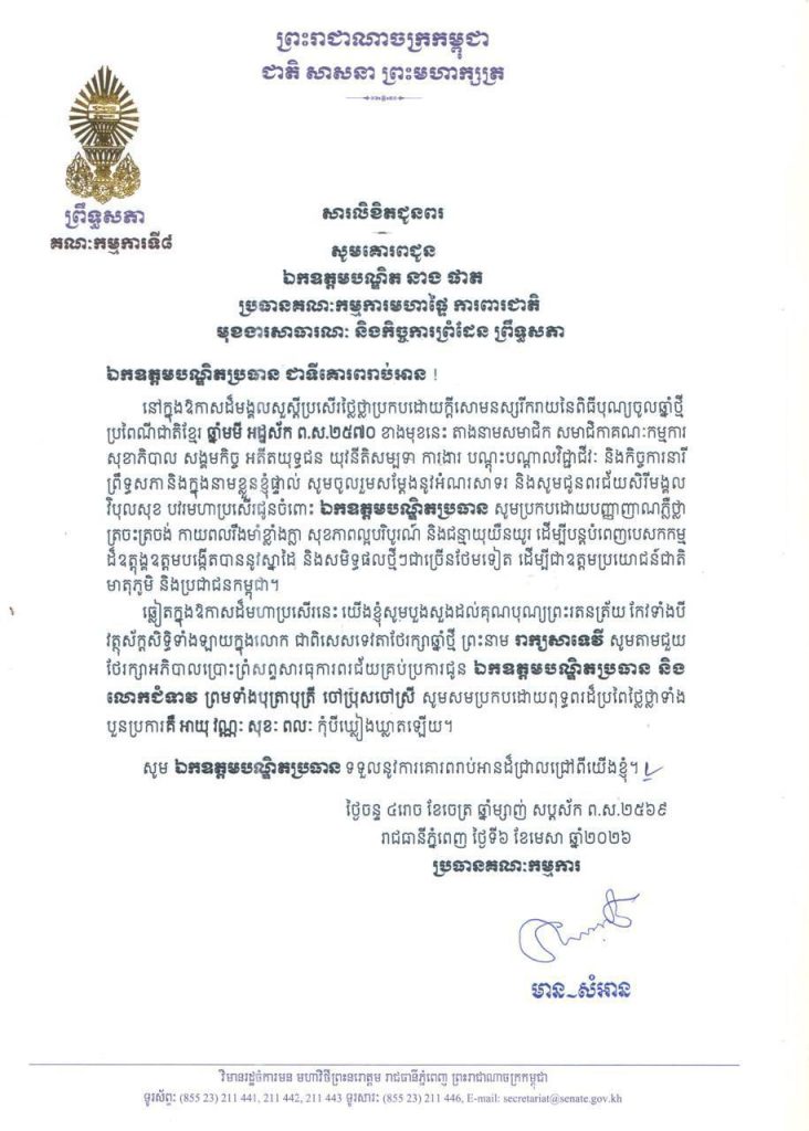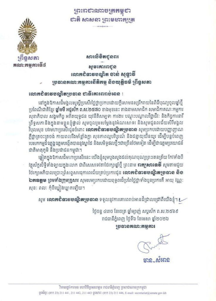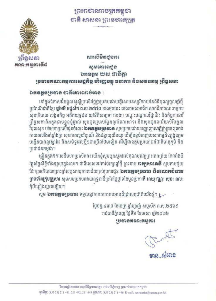 ១-សម្តេចមហាបវរធិបតី ហ៊ុន ម៉ាណែត នាយករដ្ឋមន្ត្រី នៃព្រះរាជាណាចក្រកម្ពុជា និងលោកជំទាវបណ្ឌិត ពេជ ចន្ទមុន្នី ហ៊ុនម៉ាណែត២-សម្តេចមហាមន្ត្រី គុយ សុផល ឧត្តមប្រឹក្សាផ្ទាល់ព្រះមហាក្សត្រ និងជាឧបនាយករដ្ឋមន្ត្រី រដ្ឋមន្ត្រីក្រសួងព្រះបរមរាជវាំង នៃព្រះរាជាណាចក្រកម្ពុជា៣-ឯកឧត្តម ប្រាក់ សុខុន ឧបនាយករដ្ឋមន្ត្រី និងជារដ្ឋមន្ត្រីក្រសួងការបរទេស និងសហប្រតិបត្តិការអន្តរជាតិ៤-ឯកឧត្តម ងី ច័ន្ទ្រផល ប្រធានគណៈកម្មការសិទ្ធិមនុស្ស ទទួលពាក្យបណ្តឹងនិងអង្កេត និងអធិការកិច្ច ព្រឹទ្ធសភា៥-ឯកឧត្តម យស ផានីគ្នា ប្រធានគណៈកម្មការសេដ្ឋកិច្ច ហិរញ្ញវត្ថុ ធនាគារ និងសវនកម្ម ព្រឹទ្ធសភា៦-ឯកឧត្តមបណ្ឌិត ម៉ុង ឫទ្ធី ប្រធានគណៈកម្មការផែនការ វិនិយោគ កសិកម្ម រុក្ខាប្រមាញ់ នេសាទ អភិវឌ្ឍន៍ជនបទ បរិស្ថាន ធនធានទឹក និងឧតុនិយម ព្រឹទ្ធសភា៧-ឯកឧត្តមបណ្ឌិត នាង ផាត ប្រធានគណៈកម្មការមហាផ្ទៃ ការពារជាតិ មុខងារសាធារណៈ និងកិច្ចការព្រំដែន ព្រឹទ្ធសភា៨-ឯកឧត្តមបណ្ឌិត ឈីវ យីស៊ាង ប្រធានគណៈកម្មការកិច្ចការបរទេស សហប្រតិបត្តិការអន្តរជាតិ និងព័ត៌មាន ព្រឹទ្ធសភា៩-លោកជំទាវបណ្ឌិត ចាន់ សុទ្ធាវី ប្រធានគណៈកម្មការនីតិកម្ម និងយុត្តិធម៌ ព្រឹទ្ធសភា១០-ឯកឧត្តម ឈិត សុខុន ប្រធានគណៈកម្មការអប់រំ យុវជន កីឡា ធម្មការ សាសនា វប្បធម៌ វិចិត្រសិល្បៈ និងទេសចរណ៍ ព្រឹទ្ធសភា១១-ឯកឧត្តម អ៊ុ សារឹទ្ធ ប្រធានគណៈកម្មការសាធារណការ ដឹកជញ្ជូន អាកាសចរណ៍ស៊ីវិល ប្រៃសណីយ៍ ទូរគមនាគមន៍ ឧស្សាហកម្ម វិទ្យាសាស្ត្រ បច្ចេកវិទ្យា នវានុវត្តន៍ រ៉ែ ថាមពល ពាណិជ្ជកម្ម រៀបចំដែនដី នគរូបនីយកម្ម និងសំណង់ ព្រឹទ្ធសភា១២-ឯកឧត្តម ម៉ម ប៊ុននាង ប្រធានគណៈកម្មការអង្កេត បោសសម្អាត និងប្រឆាំងអំពើពុករលួយ ព្រឹទ្ធសភា១៣-លោកជំទាវ ឡោក ខេង ប្រធានគណៈកម្មការសុខាភិបាល សង្គមកិច្ច អតីតយុទ្ធជន យុវនីតិសម្បទា ការងារ បណ្តុះបណ្តាលវិជ្ជាជីវៈ និងកិច្ចការនារី នៃរដ្ឋសភា១៤-លោកជំទាវ និន សាផុន ប្រធានគណៈកម្មការសាធារណការ ដឹកជញ្ជូន អាកាសចរណ៍ស៊ីវិល ប្រៃសណីយ៍ ទូរគមនាគមន៍ ឧស្សាហកម្ម វិទ្យាសាស្ត្រ បច្ចេកវិទ្យា នវានុវត្តន៍ រ៉ែ ថាមពល ពាណិជ្ជកម្ម រៀបចំដែនដី នគរូបនីយកម្ម និងសំណង់ នៃរដ្ឋសភា ។