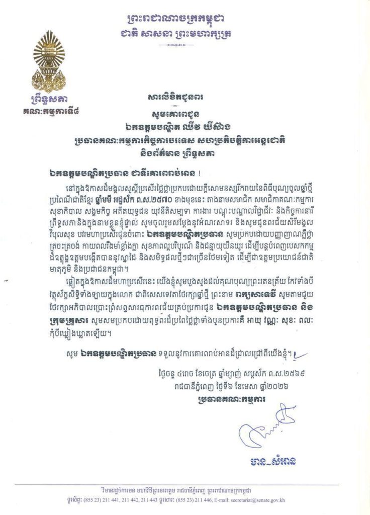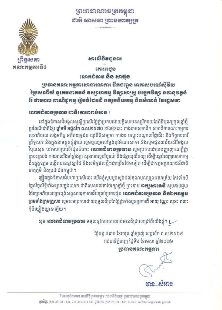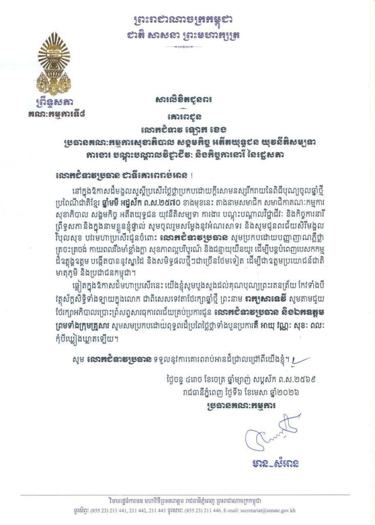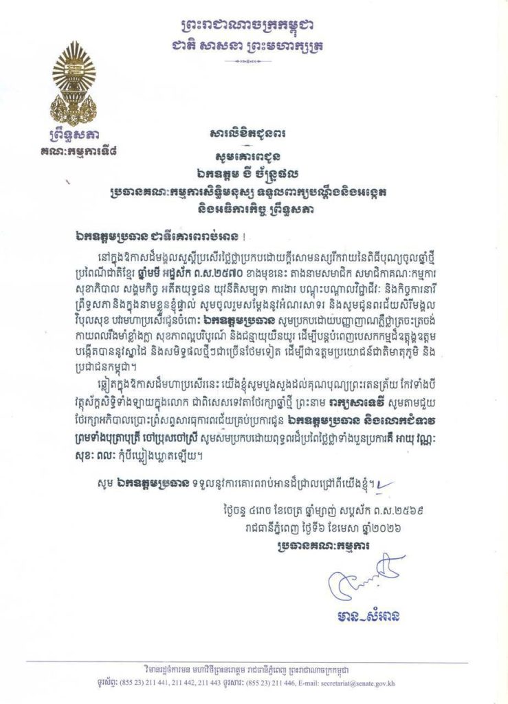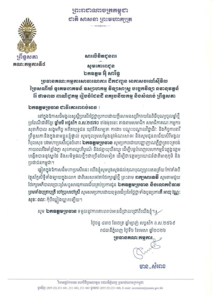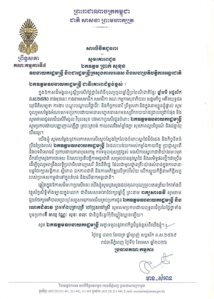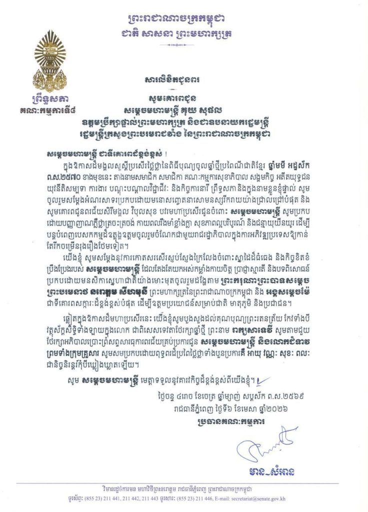 ១-សម្តេចមហាបវរធិបតី ហ៊ុន ម៉ាណែត នាយករដ្ឋមន្ត្រី នៃព្រះរាជាណាចក្រកម្ពុជា និងលោកជំទាវបណ្ឌិត ពេជ ចន្ទមុន្នី ហ៊ុនម៉ាណែត២-សម្តេចមហាមន្ត្រី គុយ សុផល ឧត្តមប្រឹក្សាផ្ទាល់ព្រះមហាក្សត្រ និងជាឧបនាយករដ្ឋមន្ត្រី រដ្ឋមន្ត្រីក្រសួងព្រះបរមរាជវាំង នៃព្រះរាជាណាចក្រកម្ពុជា៣-ឯកឧត្តម ប្រាក់ សុខុន ឧបនាយករដ្ឋមន្ត្រី និងជារដ្ឋមន្ត្រីក្រសួងការបរទេស និងសហប្រតិបត្តិការអន្តរជាតិ៤-ឯកឧត្តម ងី ច័ន្ទ្រផល ប្រធានគណៈកម្មការសិទ្ធិមនុស្ស ទទួលពាក្យបណ្តឹងនិងអង្កេត និងអធិការកិច្ច ព្រឹទ្ធសភា៥-ឯកឧត្តម យស ផានីគ្នា ប្រធានគណៈកម្មការសេដ្ឋកិច្ច ហិរញ្ញវត្ថុ ធនាគារ និងសវនកម្ម ព្រឹទ្ធសភា៦-ឯកឧត្តមបណ្ឌិត ម៉ុង ឫទ្ធី ប្រធានគណៈកម្មការផែនការ វិនិយោគ កសិកម្ម រុក្ខាប្រមាញ់ នេសាទ អភិវឌ្ឍន៍ជនបទ បរិស្ថាន ធនធានទឹក និងឧតុនិយម ព្រឹទ្ធសភា៧-ឯកឧត្តមបណ្ឌិត នាង ផាត ប្រធានគណៈកម្មការមហាផ្ទៃ ការពារជាតិ មុខងារសាធារណៈ និងកិច្ចការព្រំដែន ព្រឹទ្ធសភា៨-ឯកឧត្តមបណ្ឌិត ឈីវ យីស៊ាង ប្រធានគណៈកម្មការកិច្ចការបរទេស សហប្រតិបត្តិការអន្តរជាតិ និងព័ត៌មាន ព្រឹទ្ធសភា៩-លោកជំទាវបណ្ឌិត ចាន់ សុទ្ធាវី ប្រធានគណៈកម្មការនីតិកម្ម និងយុត្តិធម៌ ព្រឹទ្ធសភា១០-ឯកឧត្តម ឈិត សុខុន ប្រធានគណៈកម្មការអប់រំ យុវជន កីឡា ធម្មការ សាសនា វប្បធម៌ វិចិត្រសិល្បៈ និងទេសចរណ៍ ព្រឹទ្ធសភា១១-ឯកឧត្តម អ៊ុ សារឹទ្ធ ប្រធានគណៈកម្មការសាធារណការ ដឹកជញ្ជូន អាកាសចរណ៍ស៊ីវិល ប្រៃសណីយ៍ ទូរគមនាគមន៍ ឧស្សាហកម្ម វិទ្យាសាស្ត្រ បច្ចេកវិទ្យា នវានុវត្តន៍ រ៉ែ ថាមពល ពាណិជ្ជកម្ម រៀបចំដែនដី នគរូបនីយកម្ម និងសំណង់ ព្រឹទ្ធសភា១២-ឯកឧត្តម ម៉ម ប៊ុននាង ប្រធានគណៈកម្មការអង្កេត បោសសម្អាត និងប្រឆាំងអំពើពុករលួយ ព្រឹទ្ធសភា១៣-លោកជំទាវ ឡោក ខេង ប្រធានគណៈកម្មការសុខាភិបាល សង្គមកិច្ច អតីតយុទ្ធជន យុវនីតិសម្បទា ការងារ បណ្តុះបណ្តាលវិជ្ជាជីវៈ និងកិច្ចការនារី នៃរដ្ឋសភា១៤-លោកជំទាវ និន សាផុន ប្រធានគណៈកម្មការសាធារណការ ដឹកជញ្ជូន អាកាសចរណ៍ស៊ីវិល ប្រៃសណីយ៍ ទូរគមនាគមន៍ ឧស្សាហកម្ម វិទ្យាសាស្ត្រ បច្ចេកវិទ្យា នវានុវត្តន៍ រ៉ែ ថាមពល ពាណិជ្ជកម្ម រៀបចំដែនដី នគរូបនីយកម្ម និងសំណង់ នៃរដ្ឋសភា ។