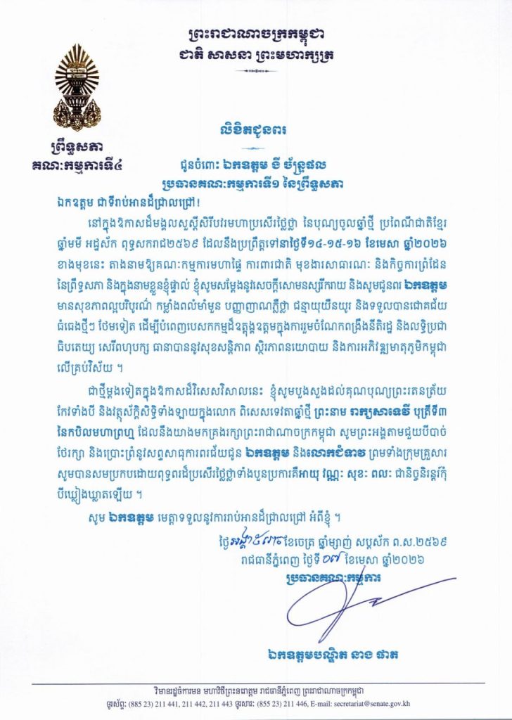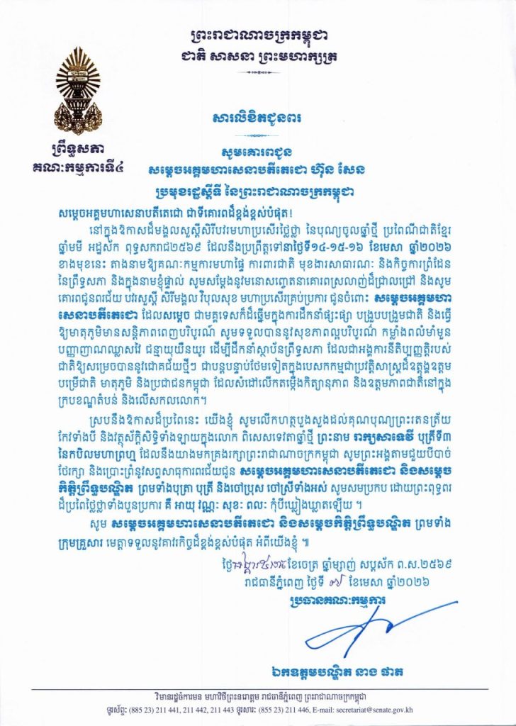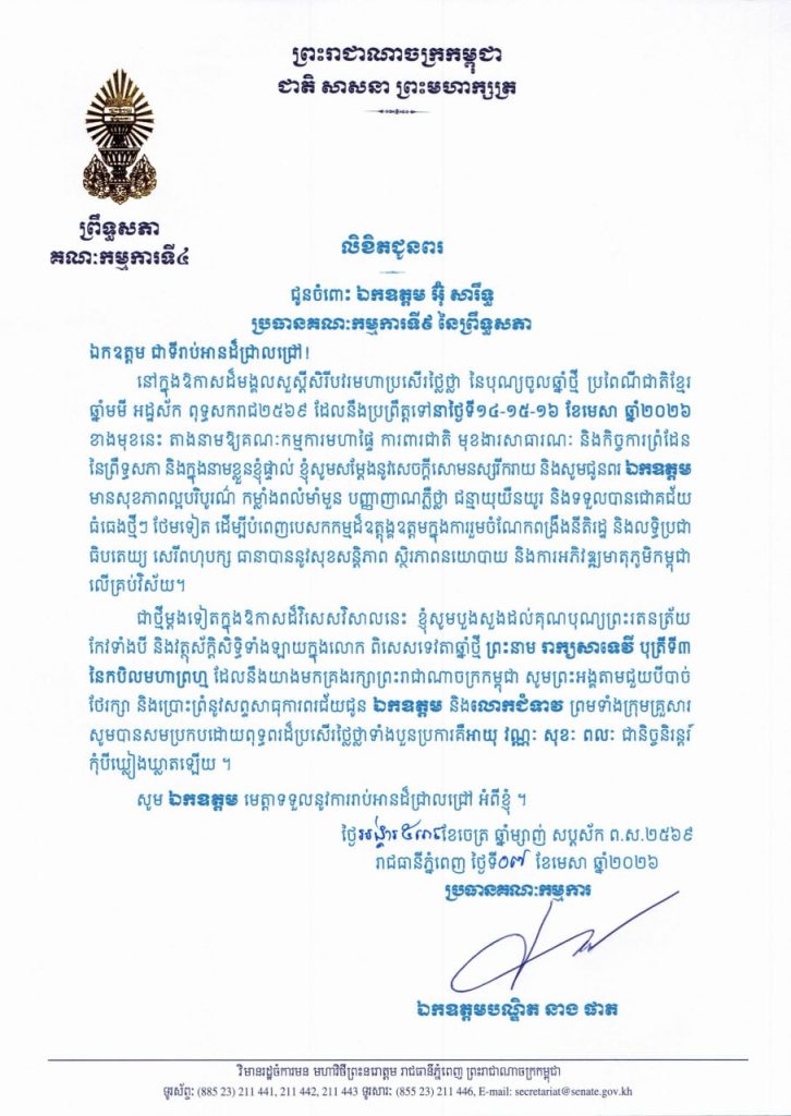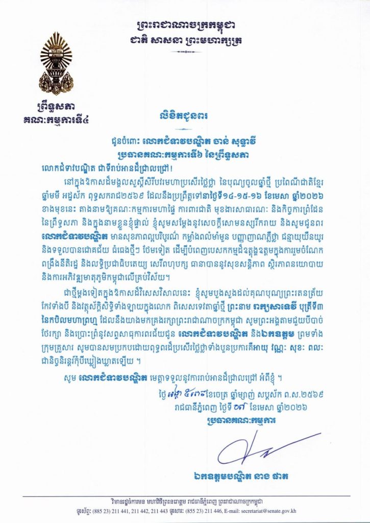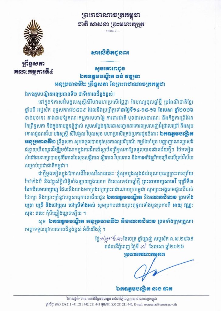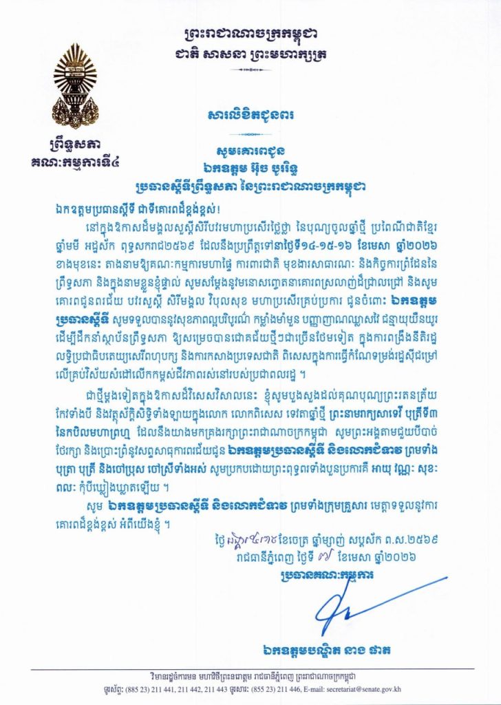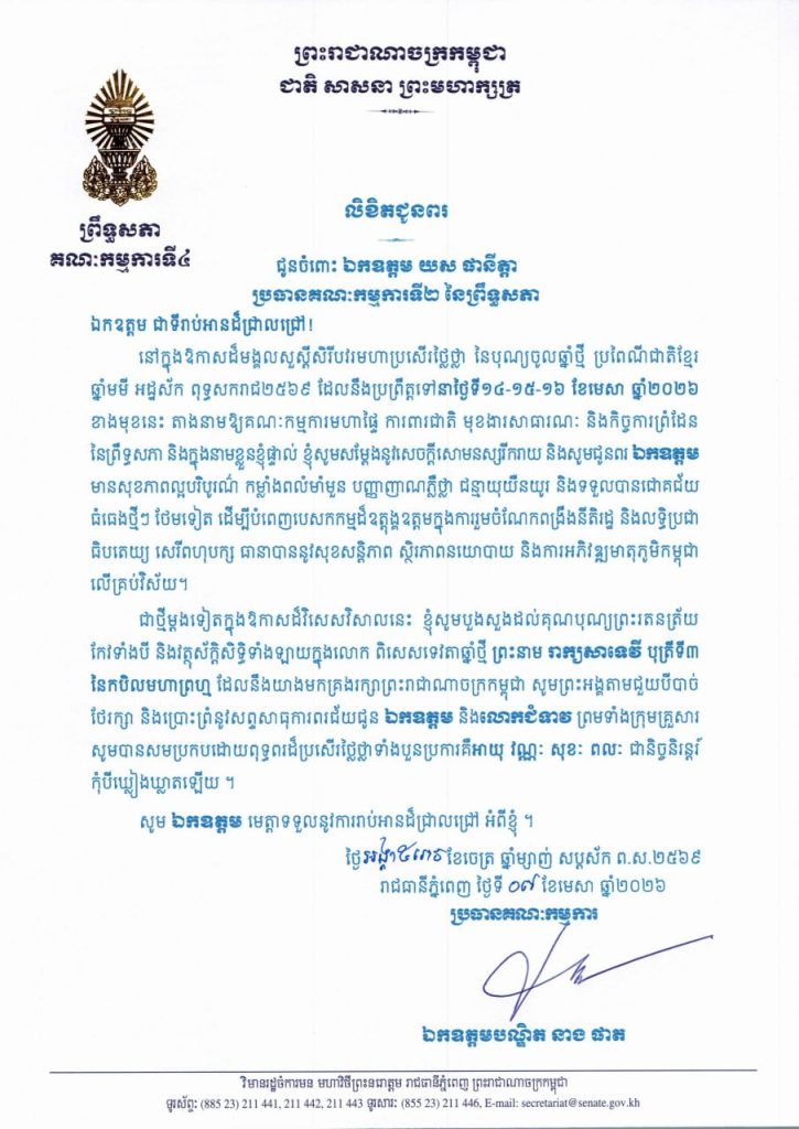 • លិខិតជូនពររបស់ឯកឧត្តមបណ្ឌិត នាង ផាត ប្រធានគណៈកម្មការទី៤ព្រឹទ្ធសភា នៅក្នុងឱកាសដ៏មង្គលសួស្តីសិរីបវរមហាប្រសើរថ្លៃថ្លា នៃបុណ្យចូលឆ្នាំថ្មី ប្រពៃណីជាតិខ្មែរ ឆ្នាំមមី អដ្ឋស័ក ពុទ្ធសករាជ២៥៦៩ ដែលនឹងប្រព្រឹត្តទៅនាថ្ងៃទី១៤-១៥-១៦ ខែមេសា ឆ្នាំ២០២៦ ខាងមុខនេះ គោរពជូន និងជូន