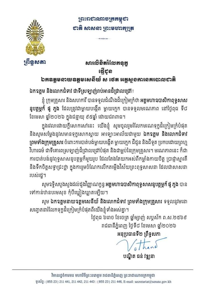 • សារលិខិតរំលែកទុក្ខរបស់ឯកឧត្តមបណ្ឌិត ធន់ វឌ្ឍនា អនុប្រធាន​ទី២ព្រឹទ្ធសភា ជូន ឯកឧត្តមនាយឧត្តមសេនីយ៍ ស ថេត អគ្គស្នងការនគរបាលជាតិ​ និងលោកជំទាវ​ ចំពោះ​មរណភាព​របស់ អគ្គមហាឧបាសិកាពុទ្ធសាសនូបត្ថម្ភក៍ ផូ ភួង ដែលត្រូវជាម្តាយបង្កើត ម្តាយក្មេក បានទទួលមរណភាពនៅថ្ងៃពុធ ទី៨ ខែមេសា ឆ្នាំ២០២៦ ក្នុងជន្មាយុ ៩៥ឆ្នាំ ដោយជរាពាធ
