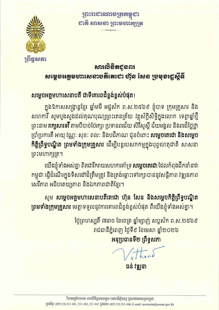 សារលិខិតជូនពររបស់ឯកឧត្តមបណ្ឌិត ធន់ វឌ្ឍនា អនុប្រធានទី២ព្រឹទ្ធសភា គោរពជូន សម្តេចអគ្គមហាសេនាបតីតេជោ ហ៊ុន សែន ប្រមុខរដ្ឋស្តីទី នៃព្រះរាជាណាចក្រកម្ពុជា ក្នុងឱកាសសង្ក្រាន្តខ្មែរ ឆ្នាំមមី អដ្ឋស័ក ព.ស.២៥៦៩