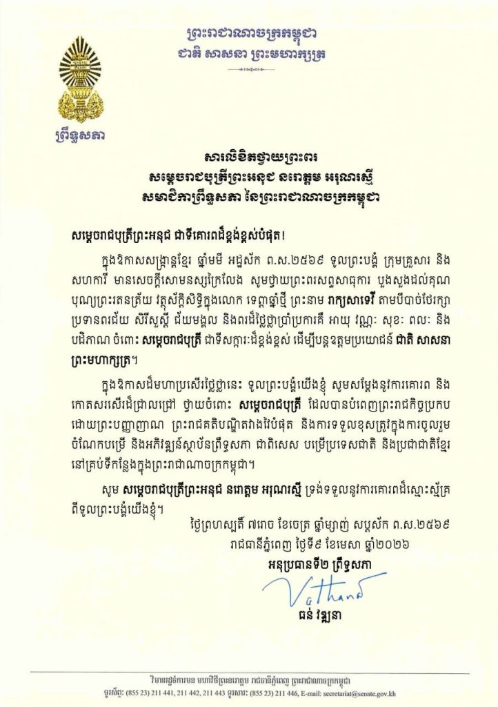 សារលិខិតថ្វាយព្រះពររបស់ឯកឧត្តមបណ្ឌិត ធន់ វឌ្ឍនា អនុប្រធានទី២ព្រឹទ្ធសភា ថ្វាយព្រះពរ សម្តេចរាជបុត្រីព្រះអនុជ នរោត្តម អរុណរស្មី សមាជិកាព្រឹទ្ធសភា នៃព្រះរាជាណាចក្រកម្ពុជា ក្នុងឱកាសសង្ក្រាន្តខ្មែរ ឆ្នាំមមី អដ្ឋស័ក ព.ស.២៥៦៩