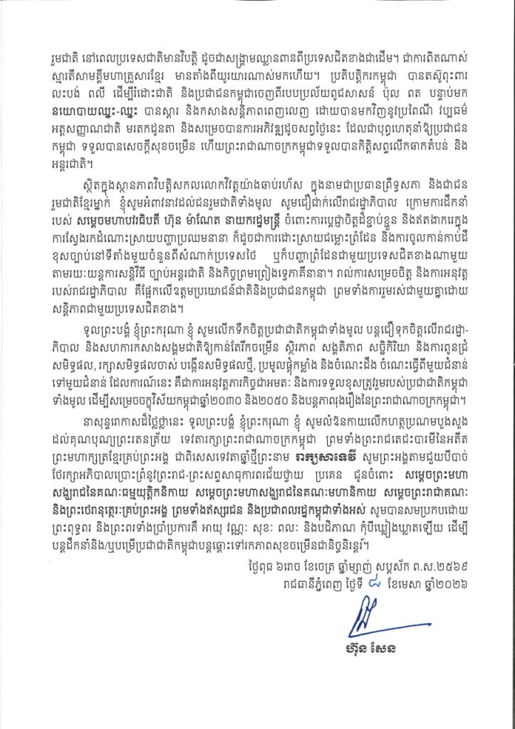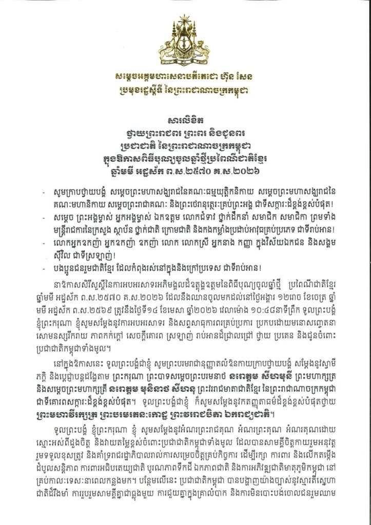 សារលិខិតថ្វាយព្រះរាជពរ ព្រះពរ និងជូនពរ របស់សម្តេចអគ្គមហាសេនាបតីតេជោ ហ៊ុន សែន ប្រមុខរដ្ឋស្តីទី នៃព្រះរាជាណាចក្រកម្ពុជា ថ្វាយព្រះរាជពរ ព្រះពរ និងជូនពរ ប្រជាជាតិ នៃព្រះរាជាណាចក្រកម្ពុជា ក្នុងឱកាសពិធីបុណ្យចូលឆ្នាំថ្មីប្រពៃណីជាតិខ្មែរ ឆ្នាំមមី អដ្ឋស័ក ព.ស.២៥៧០ គ.ស.២០២៦