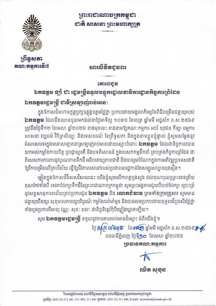 • សារលិខិតជូនពររបស់ឯកឧត្តម ឈិត សុខុន ប្រធានគណៈកម្មការទី៧ព្រឹទ្ធសភា គោរពជូន ឯកឧត្តម ឡាំ ជា រដ្ឋមន្ត្រីទទួលបន្ទុករដ្ឋលេខាធិការដ្ឋានកិច្ចការព្រំដែន ក្នុងឱកាសដ៏មហានក្ខត្តឫក្សឧត្តុង្គឧត្តមថ្លៃថ្លា ប្រកបដោយមង្គលាភិរម្យនៃពិធីចម្រើនជន្មាយុរបស់ឯកឧត្តម ដែលនឹងឈានចូលមកដល់នាថ្ងៃអាទិត្យ ទី១២ ខែមេសា ឆ្នាំ២០២៦ ខាងមុខនេះ