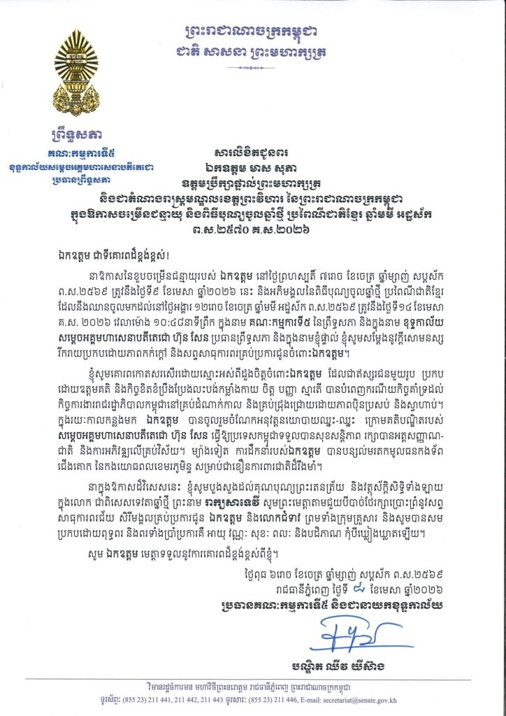 • សារលិខិតជូនពររបស់ឯកឧត្តមបណ្ឌិត ឈីវ យីស៊ាង ប្រធានគណៈកម្មការ​ទី៥ព្រឹទ្ធសភា និងជានាយកខុទ្ធកាល័យ​សម្តេច​តេជោ ប្រធានព្រឹទ្ធសភា គោរពជូន​ ឯកឧត្តម មាស សុភា ឧត្តមប្រឹក្សាផ្ទាល់ព្រះមហាក្សត្រ និងជាតំណាងរាស្ត្រមណ្ឌលខេត្តព្រះវិហារ នៃព្រះរាជាណាចក្រកម្ពុជា ក្នុងឱកាសចម្រើនជន្មាយុ និងពិធីបុណ្យចូលឆ្នាំថ្មី ប្រពៃណីជាតិខ្មែរ ឆ្នាំមមី អដ្ឋស័ក ព.ស.២៥៧០ គ.ស.២០២៦