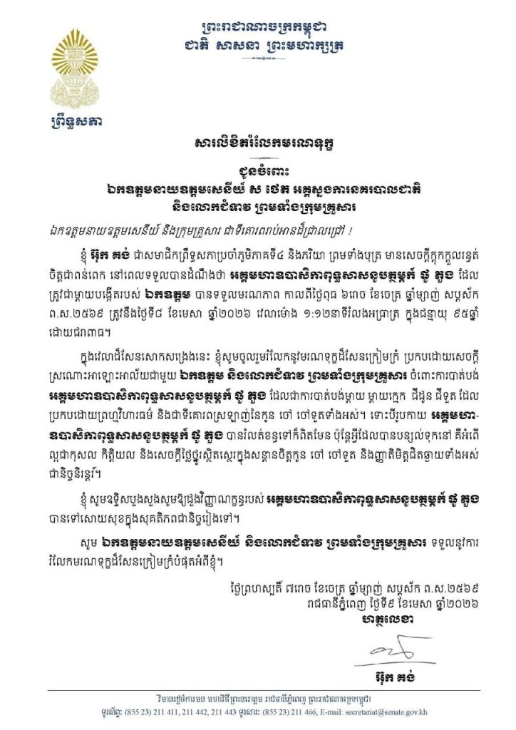សារលិខិតរំលែកមរណទុក្ខរបស់ឯកឧត្តម អ៊ុក គង់ សមាជិកក្រុមសមាជិកព្រឹទ្ធសភាប្រចាំភូមិភាគទី៤ និងភរិយា ជូនចំពោះ ឯកឧត្តមនាយឧត្តមសេនីយ៍ ស ថេត អគ្គស្នងការនគរបាលជាតិ និងលោកជំទាវ ព្រមទាំងក្រុមគ្រួសារ មរណភាពរបស់ អគ្គមហាឧបាសិកាពុទ្ធសាសនូបត្ថម្ភក៍ ផូ ភួង ដែល ត្រូវជាម្តាយបង្កើតរបស់ឯកឧត្តម