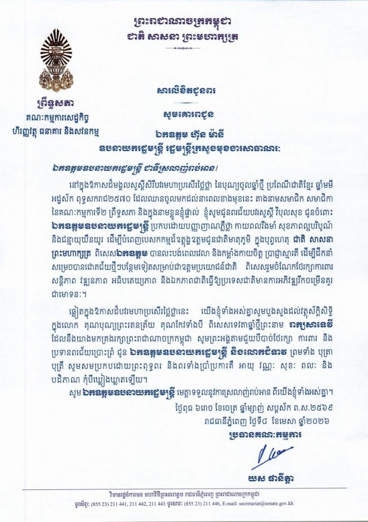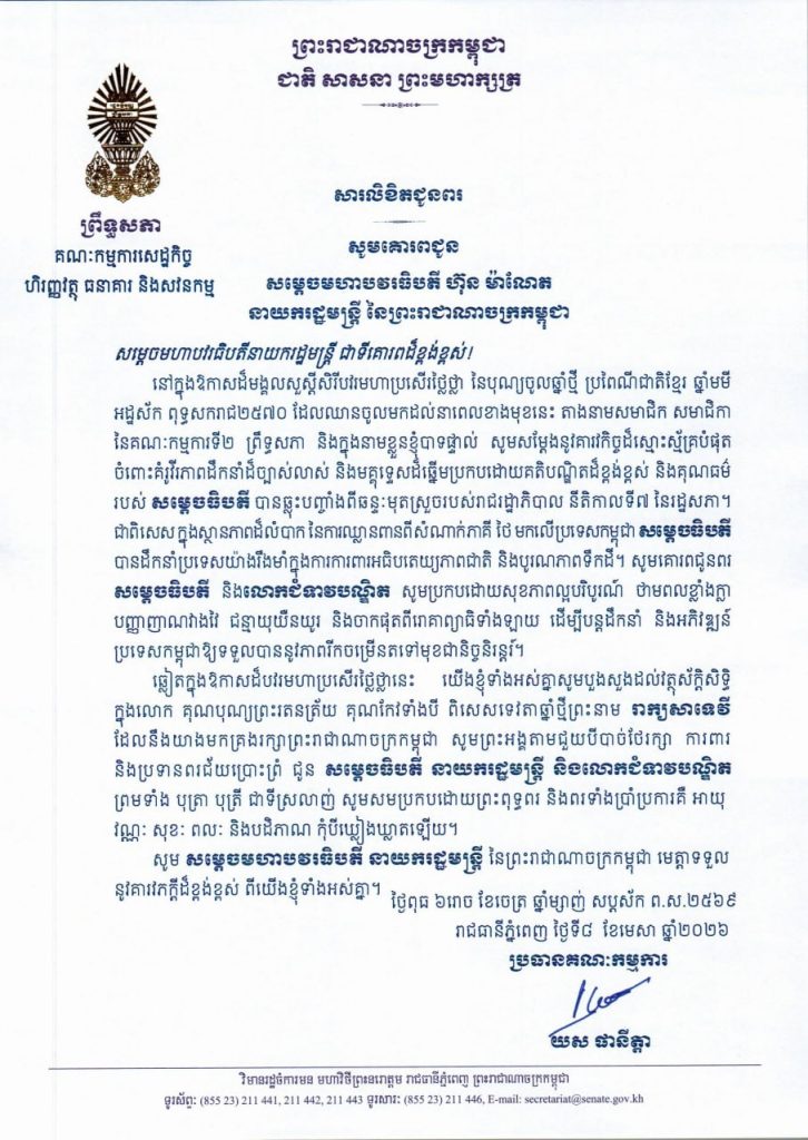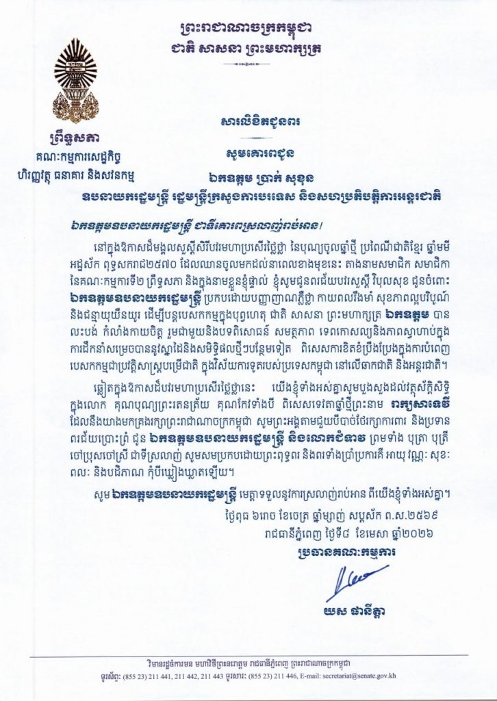 សារលិខិតថ្វាយព្រះពររបស់លោកជំទាវ មាន សំអាន ប្រធានក្រុមសមាជិកាព្រឹទ្ធសភា ថ្វាយព្រះពរ ព្រះករុណាព្រះបាទសម្តេចព្រះបរមនាថ នរោត្តម សីហមុនី ព្រះមហាក្សត្រ នៃព្រះរាជាណាចក្រកម្ពុជា ក្នុងឱកាសដ៏មហានក្ខត្តឫក្សឧត្តុង្គឧត្តមថ្លៃថ្លា នៃពិធីបុណ្យចូលឆ្នាំថ្មីប្រពៃណីជាតិខ្មែរ ឆ្នាំមមី អដ្ឋស័ក ព.ស.២៥៧០ គ.ស.២០២៦