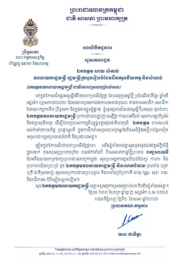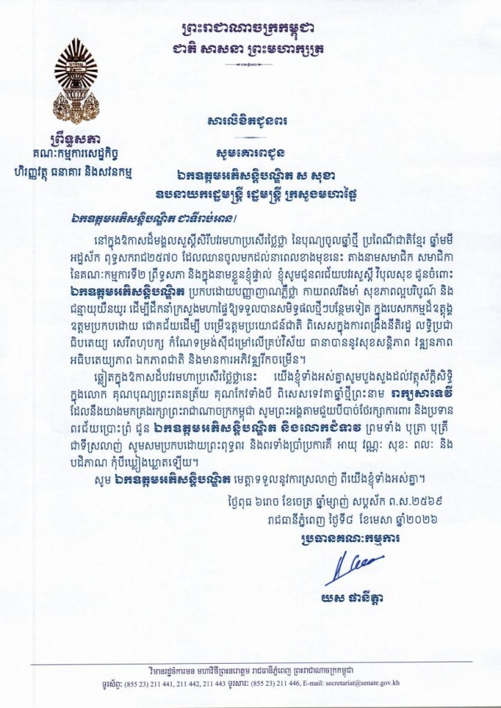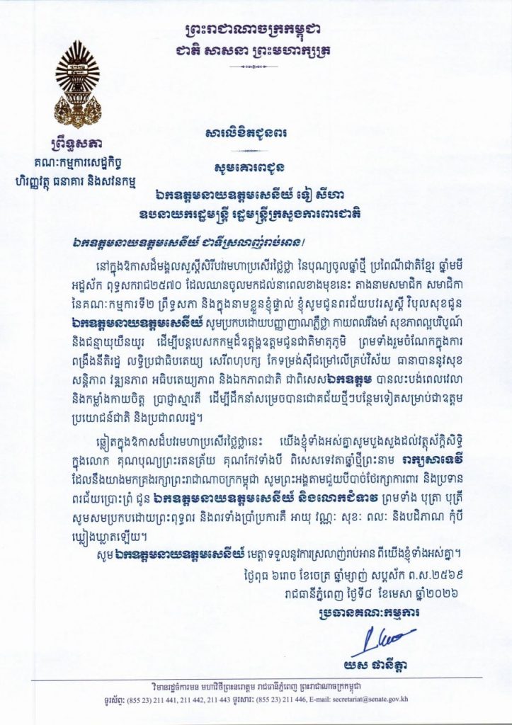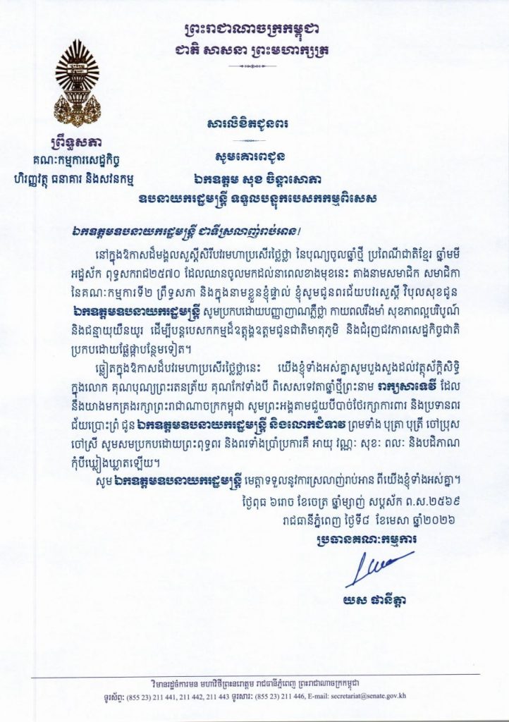 • សារលិខិតជូនពររបស់ឯកឧត្តម យស ផានីត្តា ប្រធានគណៈកម្មការទី២ព្រឹទ្ធសភា ក្នុងឱកាសដ៏មង្គលសួស្តីសិរីបវរមហាប្រសើរថ្លៃថ្លា នៃបុណ្យចូលឆ្នាំថ្មី ប្រពៃណីជាតិខ្មែរ ឆ្នាំមមី អដ្ឋស័ក ពុទ្ធសករាជ២៥៧០ ដែលឈានចូលមកដល់នាពេលខាងមុខនេះ គោរពជូន