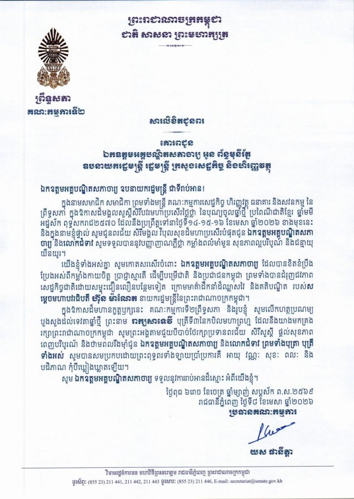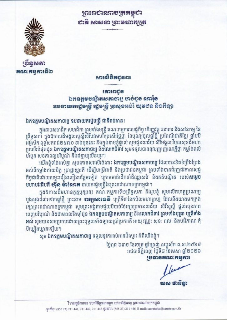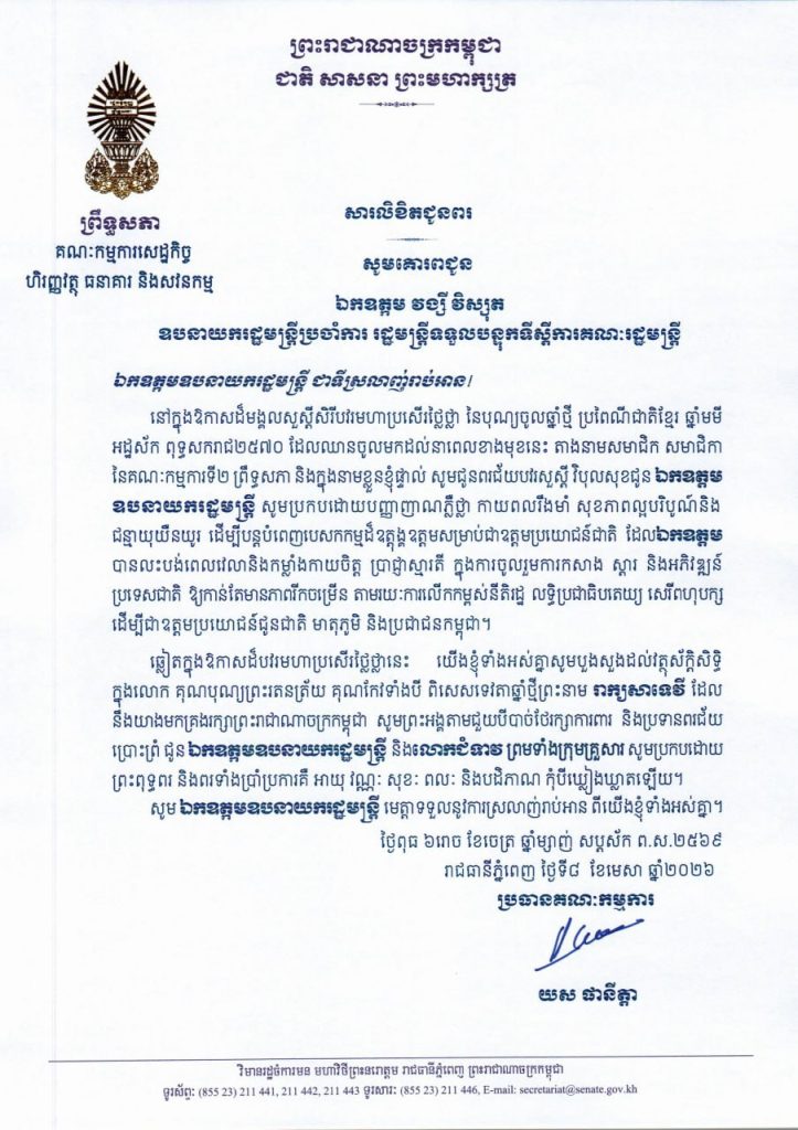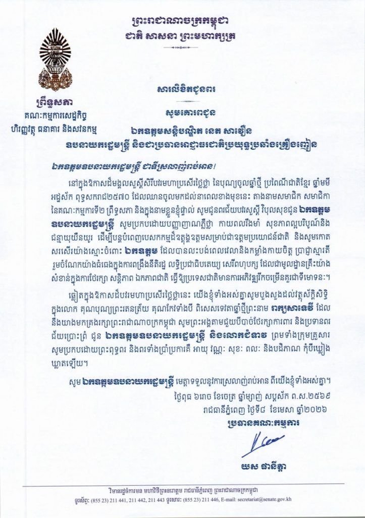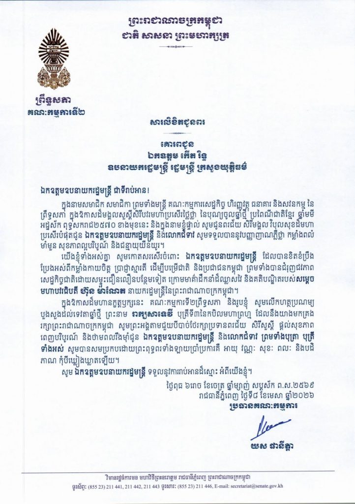 • សារលិខិតជូនពររបស់ឯកឧត្តម យស ផានីត្តា ប្រធានគណៈកម្មការទី២ព្រឹទ្ធសភា ក្នុងឱកាសដ៏មង្គលសួស្តីសិរីបវរមហាប្រសើរថ្លៃថ្លា នៃបុណ្យចូលឆ្នាំថ្មី ប្រពៃណីជាតិខ្មែរ ឆ្នាំមមី អដ្ឋស័ក ពុទ្ធសករាជ២៥៧០ ដែលឈានចូលមកដល់នាពេលខាងមុខនេះ គោរពជូន