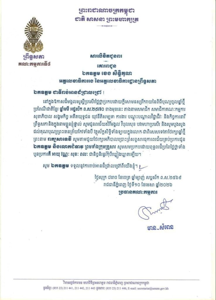 សារលិខិតជូនពររបស់លោកជំទាវ មាន សំអាន ប្រធានក្រុមសមាជិកាព្រឹទ្ធសភា ក្នុងឱកាសដ៏មហានក្ខត្តឫក្សឧតុង្គឧត្តមថ្លៃថ្លា នៃពិធីបុណ្យចូលឆ្នាំថ្មីប្រពៃណីជាតិខ្មែរ ឆ្នាំមមី អដ្ឋស័ក ព.ស.២៥៧០ គ.ស.២០២៦ គោរពជូន