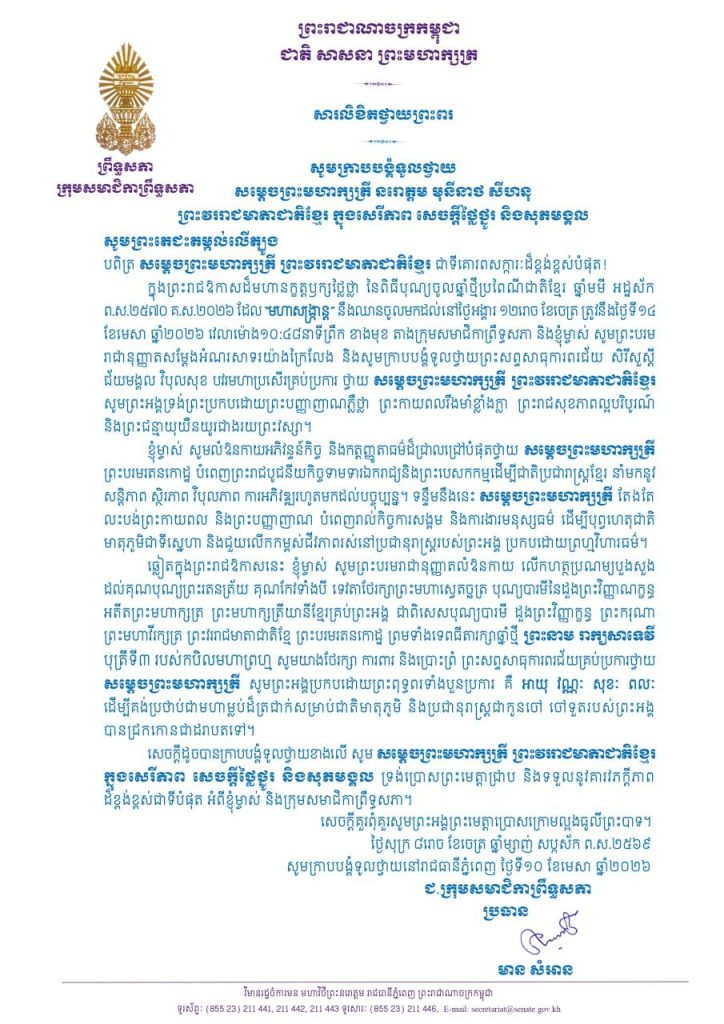 សារលិខិតថ្វាយព្រះពររបស់លោកជំទាវ មាន សំអាន ប្រធានក្រុមសមាជិកាព្រឹទ្ធសភា ថ្វាយព្រះពរ សម្តេចព្រះមហាក្សត្រី នរោត្តម មុនីនាថ សីហនុ ព្រះវររាជមាតាជាតិខ្មែរ ក្នុងសេរីភាព សេចក្តីថ្លៃថ្នូរ និងសុភមង្គល ក្នុងឱកាសដ៏មហានក្ខត្តឫក្សឧត្តុង្គឧត្តមថ្លៃថ្លា នៃពិធីបុណ្យចូលឆ្នាំថ្មីប្រពៃណីជាតិខ្មែរ ឆ្នាំមមី អដ្ឋស័ក ព.ស.២៥៧០ គ.ស.២០២៦